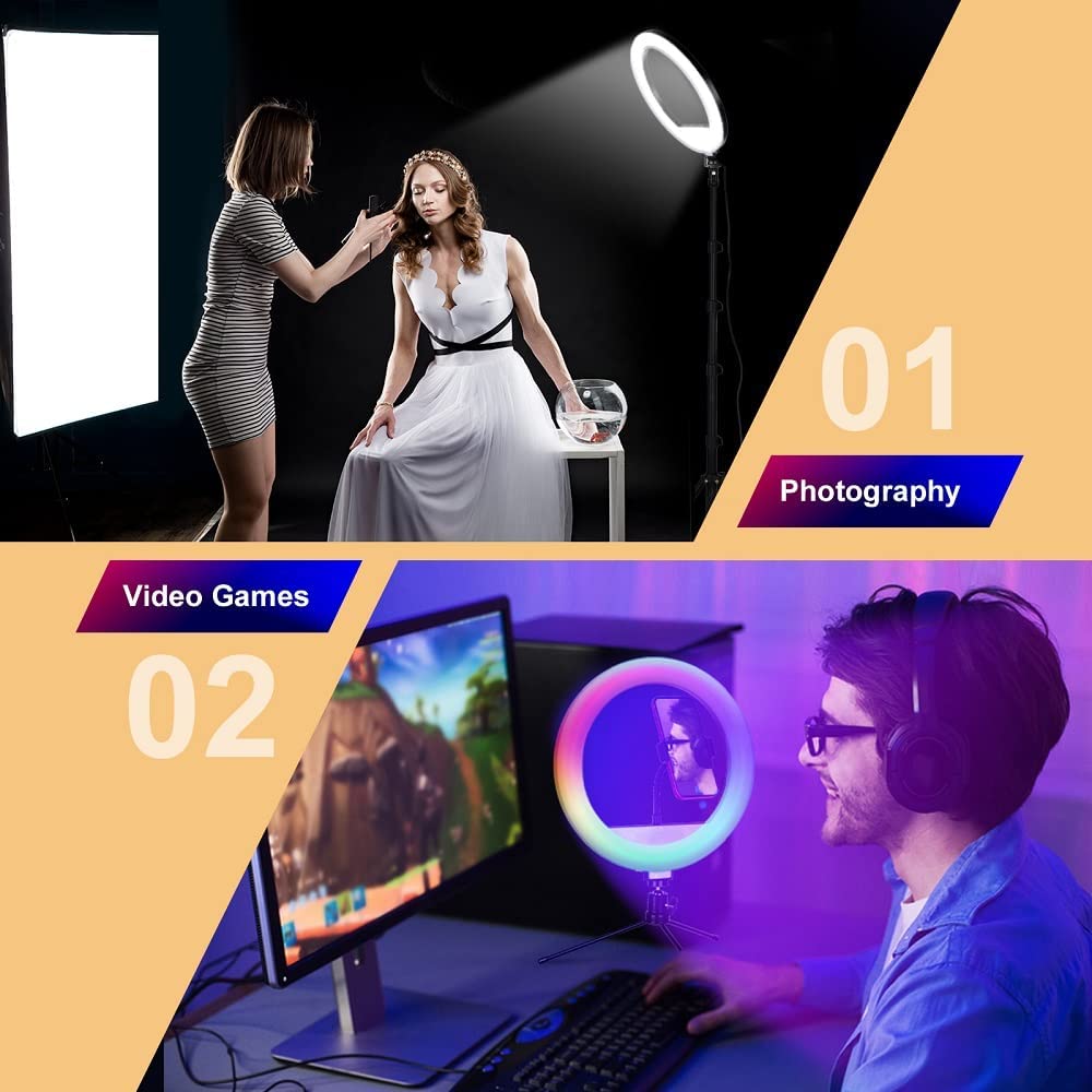 • 【Color Ring Lights USB Powered】Phone Ring Light Tripod is USB powered and works with most devices that support USB port, like laptop, PC, power bank, USB chargerand etc.34 color modes Tik Tok Light Ring with stand for YouTube Video Vlog TikTok Suitable iPhone Android Camera.