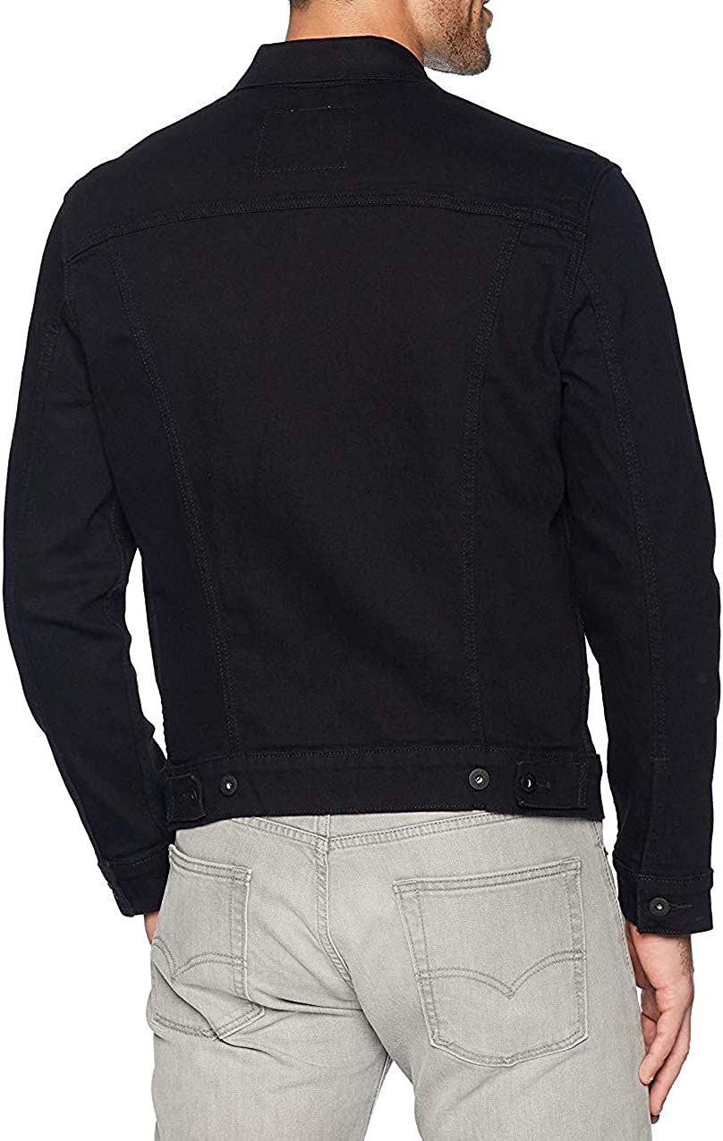 Man wearing levis trucker jacket over grey hoodie plus close up of pocket details