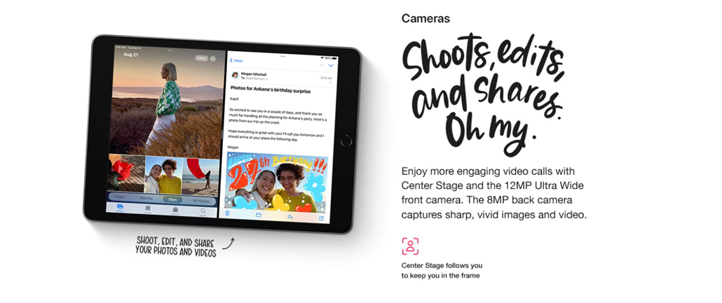 • 8MP Wide back camera, 12MP Ultra Wide front camera with Center Stage
