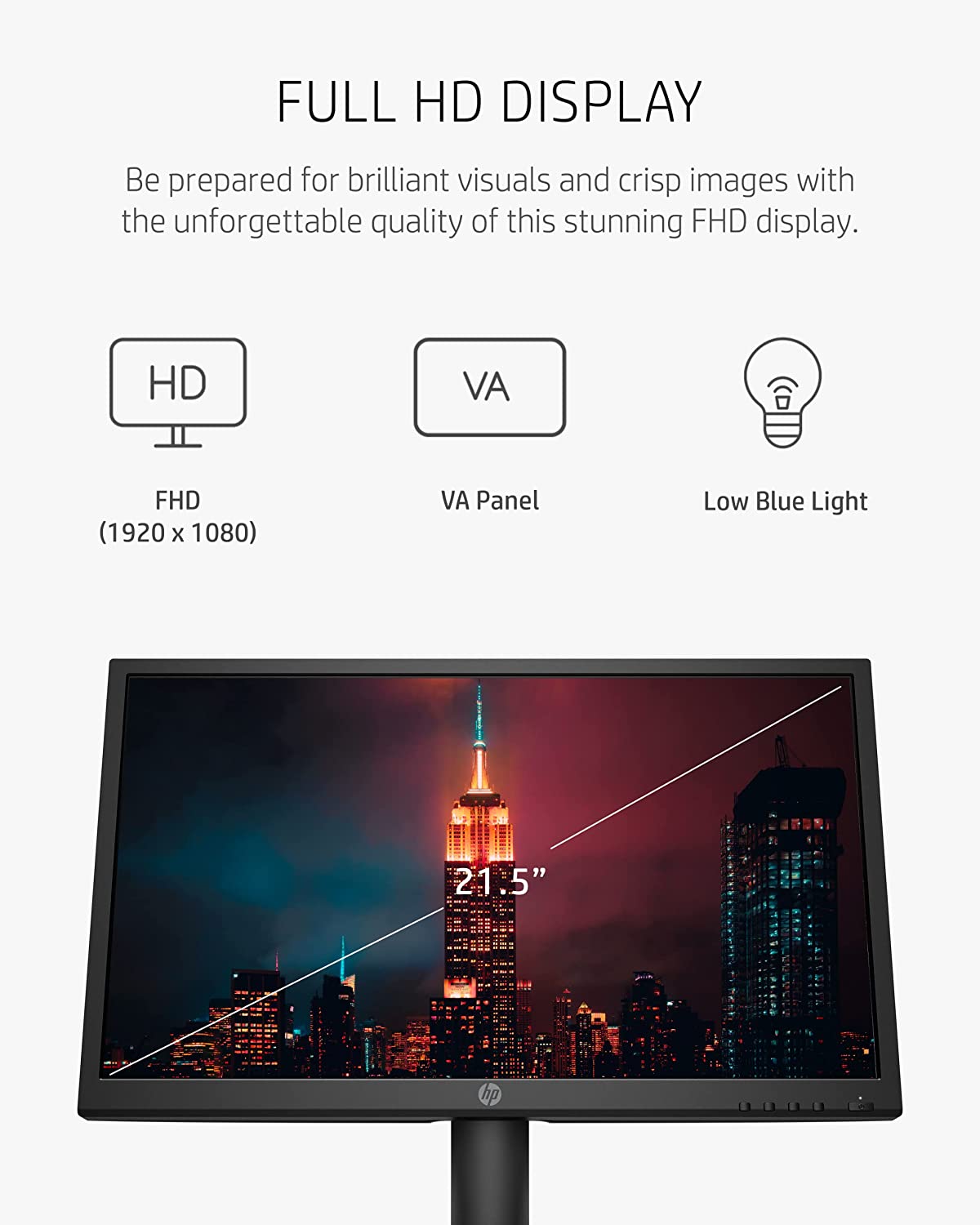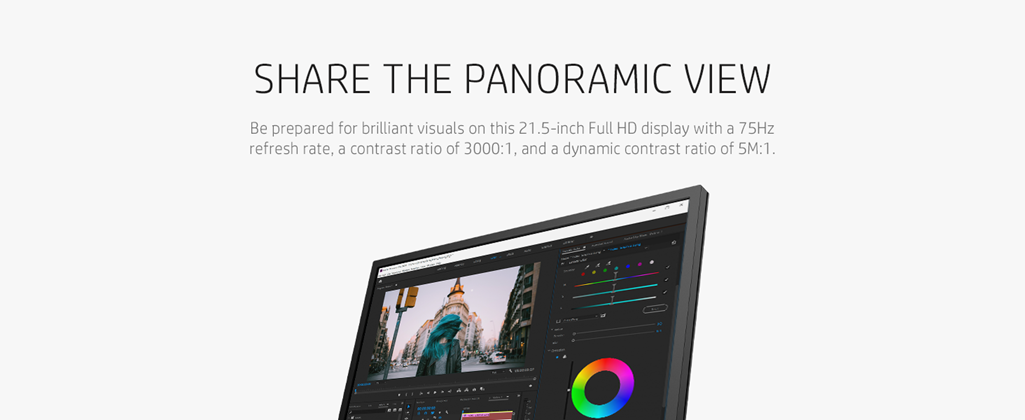 • FULL HD DISPLAY – Be prepared for brilliant visuals on this 21.5-inch Full HD display (1); enjoy colors that pop and superb black levels thanks to its 75Hz refresh rate, a contrast ratio of 3000:1, and a dynamic contrast ratio of 5M:1 (2).