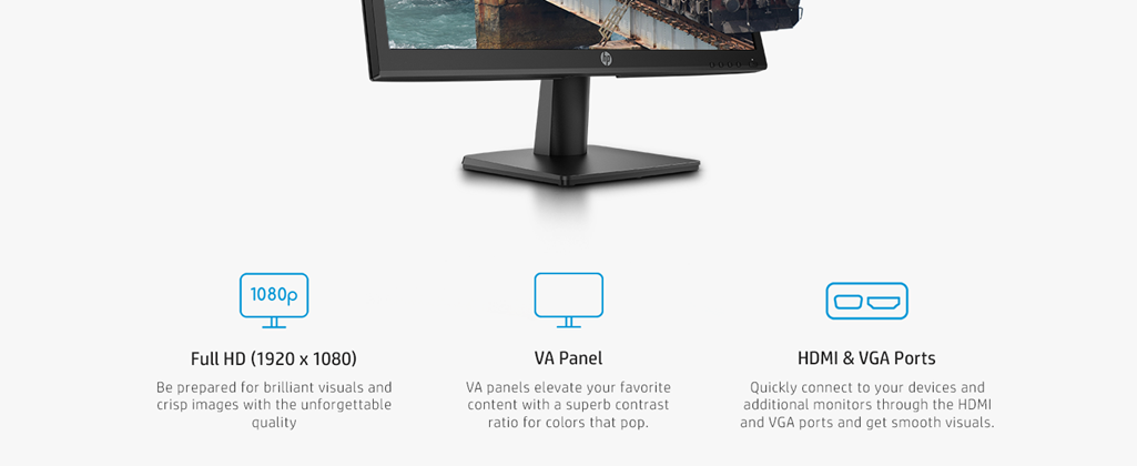 Browse the web, stream your shows, and get work done on the everyday HP V223ve FHD Monitor. This HP computer monitor’s 21.5-inch Full HD screen boasts unparalleled visuals every time you turn it on (1). What’s more is that the 1080p monitor features a 75Hz refresh rate for smoother images, plus a superb contrast ratio for better color differentiation (2). No matter where you view your HP monitor, the VA panel ensures image clarity is maintained across ultra-wide 178-degree horizontal and vertical viewing angles. Easily connect a laptop, an external storage drive, or an additional monitor with the HDMI and VGA ports. Get the most out of a PC monitor designed for both comfort and efficiency. The TÜV certified Low Blue Light Mode limits the strain put on your eyes, while the tilt-adjustable display ensures comfortable posture all day. Beyond this HDMI monitor’s comfort settings, the narrow bezel design keeps things stylish and productive, letting you see more of your favorite show or word document. Customize your display with ease thanks to the intuitive HP Display Center software; through the host PC, you can personalize every little detail from display settings, screen partitioning, and even dimming the screen. Further customize the way you use this monitor with standard 100 x 100 millimeters VESA mounting options (3). This 75Hz monitor’s energy-efficient design isn't just for you but the environment too, as your device reduces power consumption and energy costs. Plus, the materials used in the packaging are 100% sustainably sourced and recyclable (4). Rest easy as your monitor is covered by an HP 1-year limited hardware warranty. (1) Full high-definition (FHD) content is required to view FHD images. (2) During video playback only, depending on series of frames or time duration. (3) Bracket not included. (4) 100% outer box/corrugate cushion packaging made from sustainably sourced certified and recycled fibers. Fiber cushions are made from 100% recycled wood fiber and organic material. Excludes plastic bags and plastic foam sheeting. 06/04/2021_r1 tg.