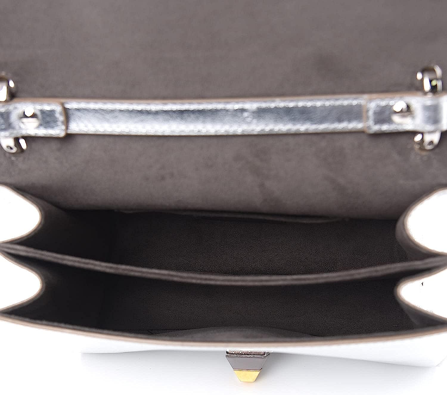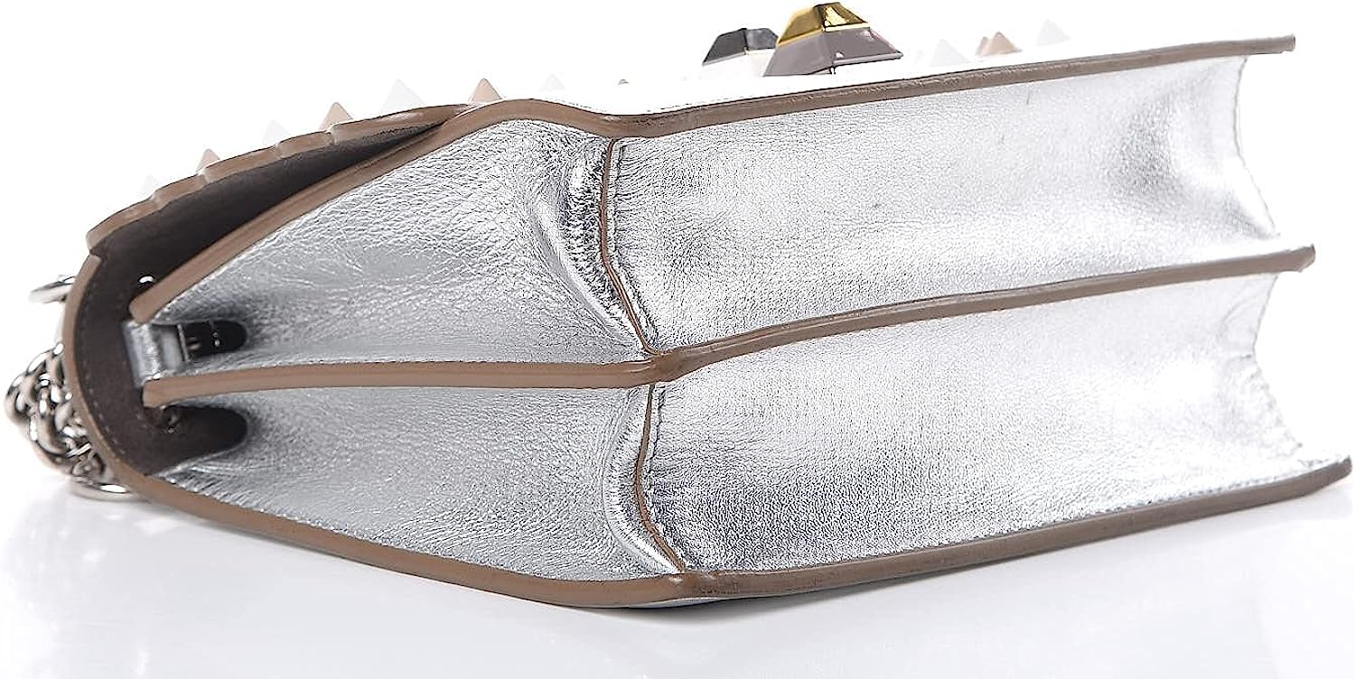 This shoulder bag is crafted of smooth calfskin leather in metallic silver with scalloped edges. This shoulder bag features a long polished silver-tone chain link strap with a shoulder pad and silver rings on the anchor to hold bag charms. The front flap has a decorative pyramid stud closure. The front opens to a partitioned grey suede interior with a patch pocket. This handbag is perfect for day or evening use, from Fendi!