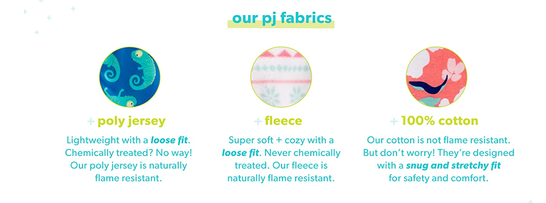 • Cotton pjs are not flame resistant. To help keep children safe, cotton pjs should always fit snugly.