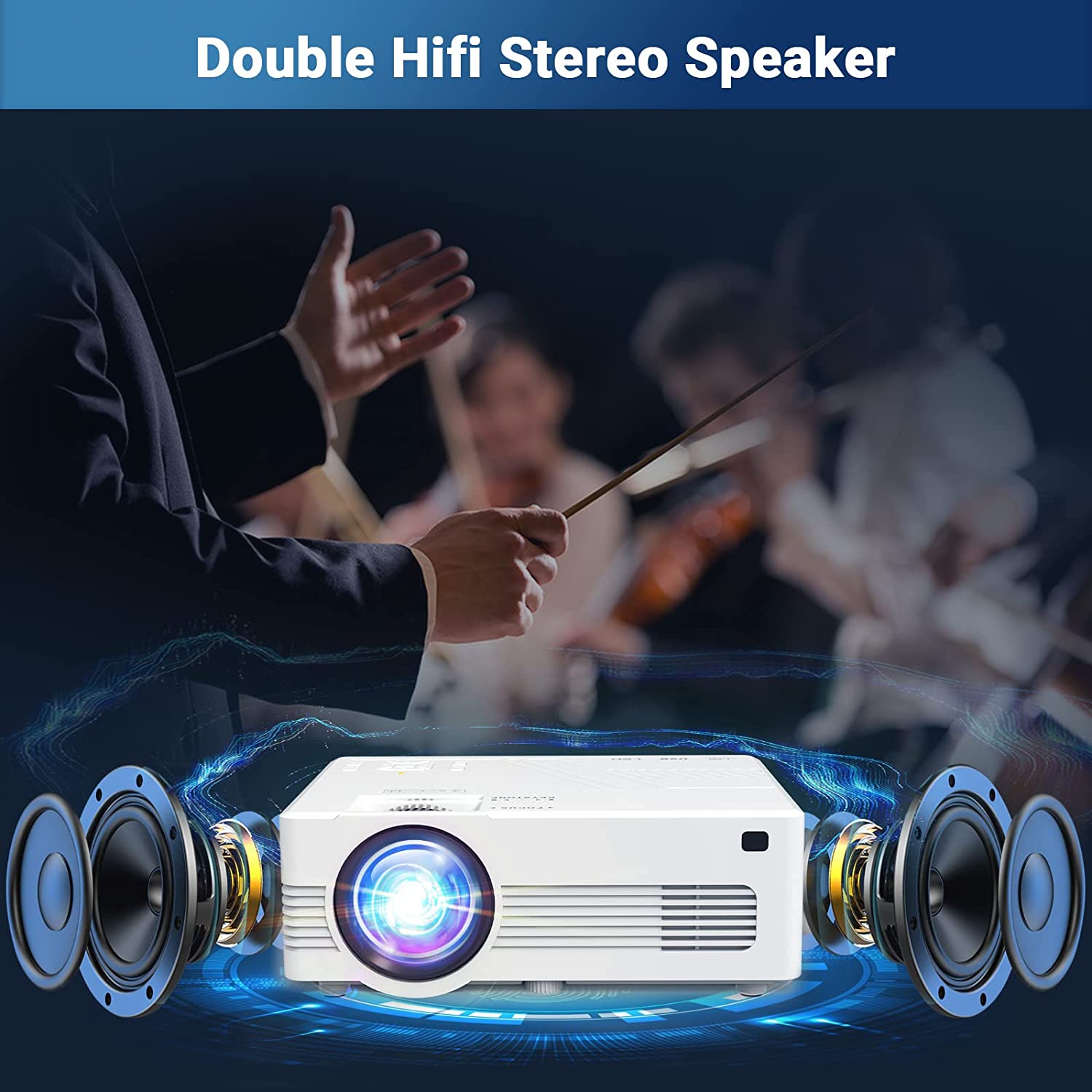 • ?【2023 Updated Dual Hi-Fi Speaker】This Movie projector equipped with two Built-In speakers with advanced audio technology. It helps our customers get best audio quality no matter where our customer is. Two Built-in Speakers Brings Excellent Sound Quality when you are in party, family gathering, or Summer Camping.