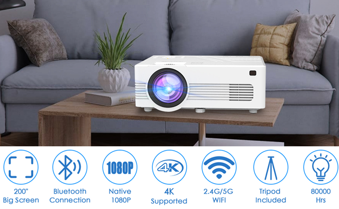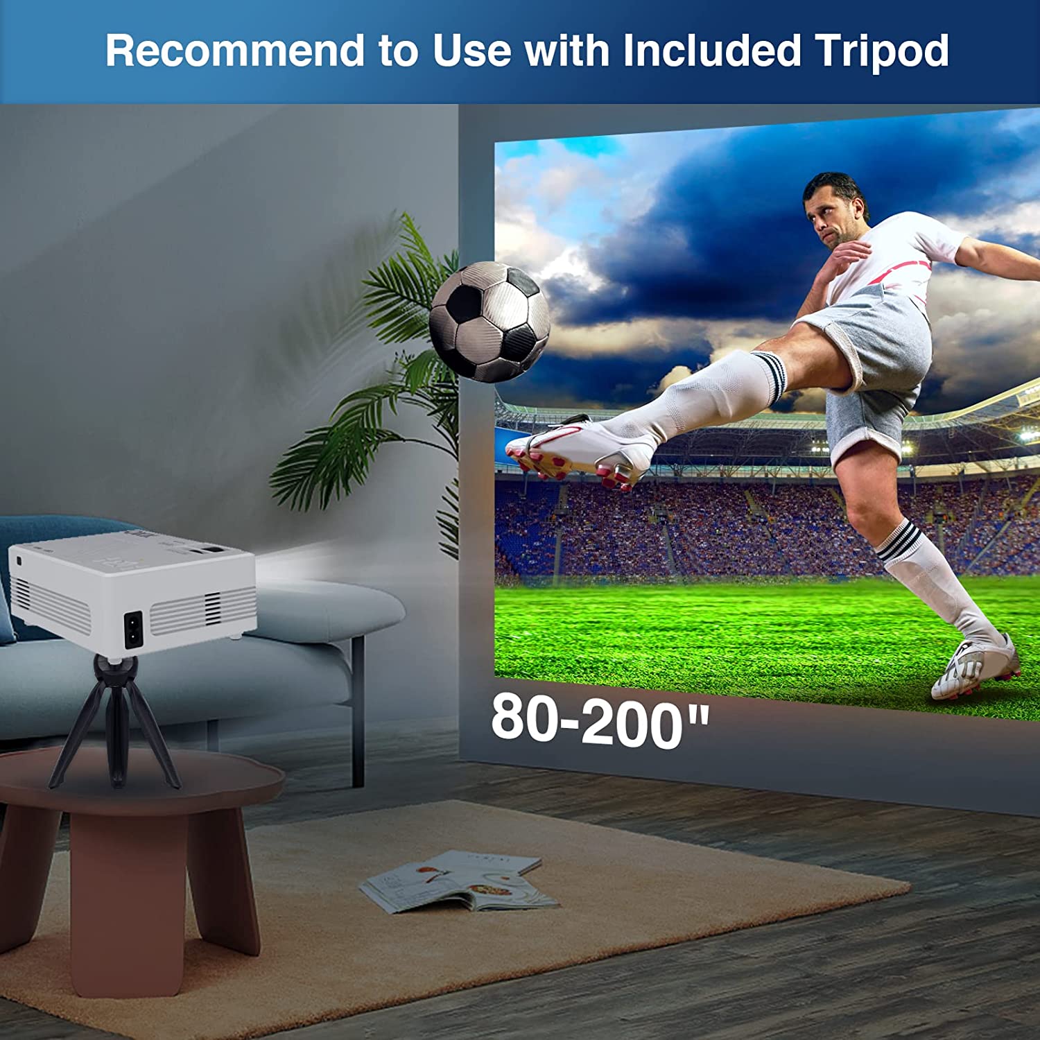 Vecupou mini projector with WIFI and bluetooth allows you to project images from 45 "to 200" depending on the distance from 1.5-5.5 meters. (Recommend 3m). The 200" big projection screen brings a stunning, immersive viewing experience, suitable for watching movies, playing games, and enjoying sports competitions.