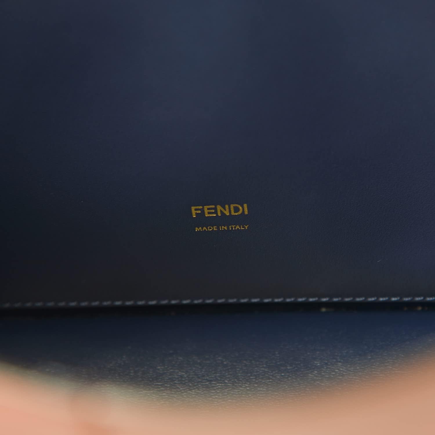 This "Kan U" shoulder bag is crafted of calfskin leather in a rust brown color. The handbag features an adjustable leather shoulder strap. The front flap opens with a gold-tone push-lock to a spacious brown suede and navy blue leather lined interior with a patch pocket. This is the perfect everyday bag, from Fendi!