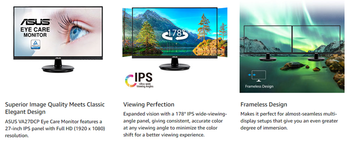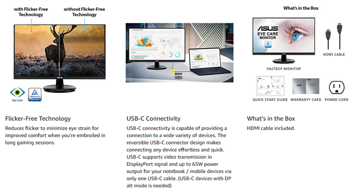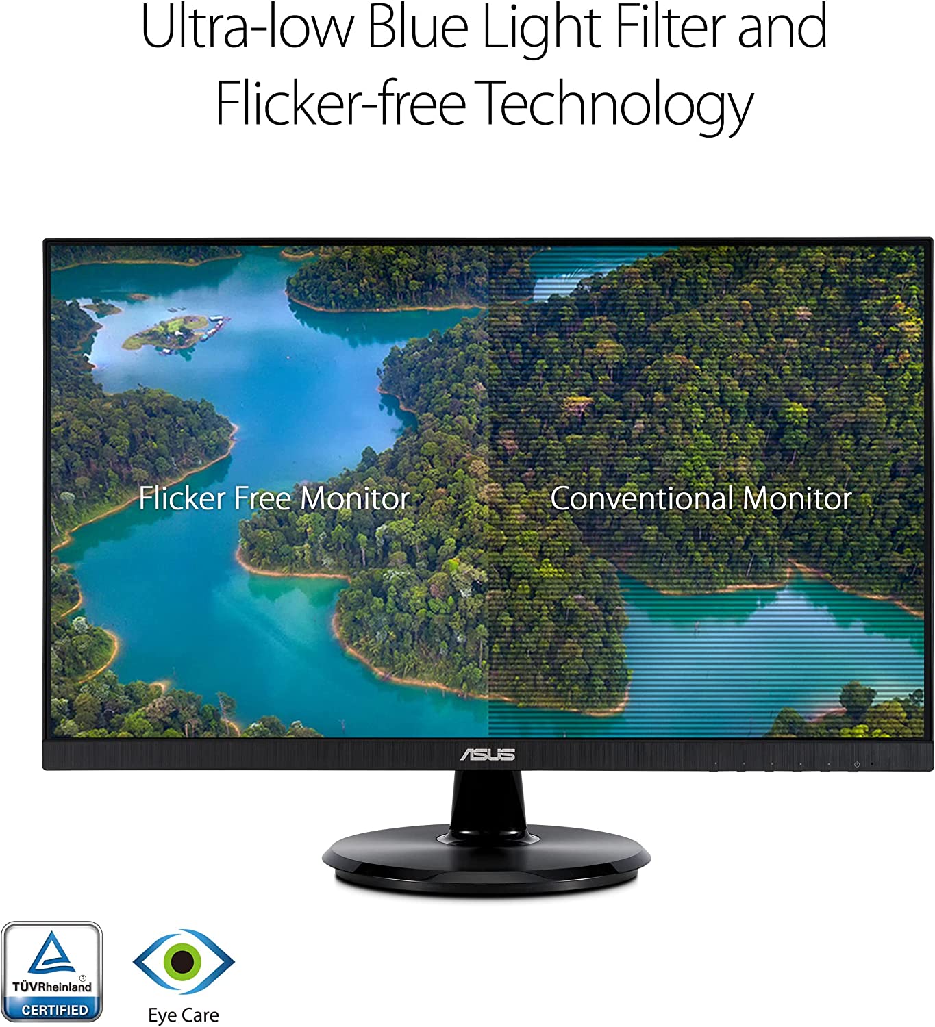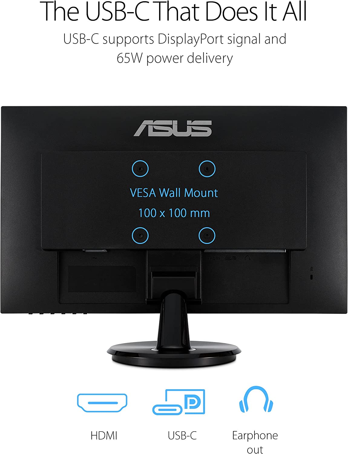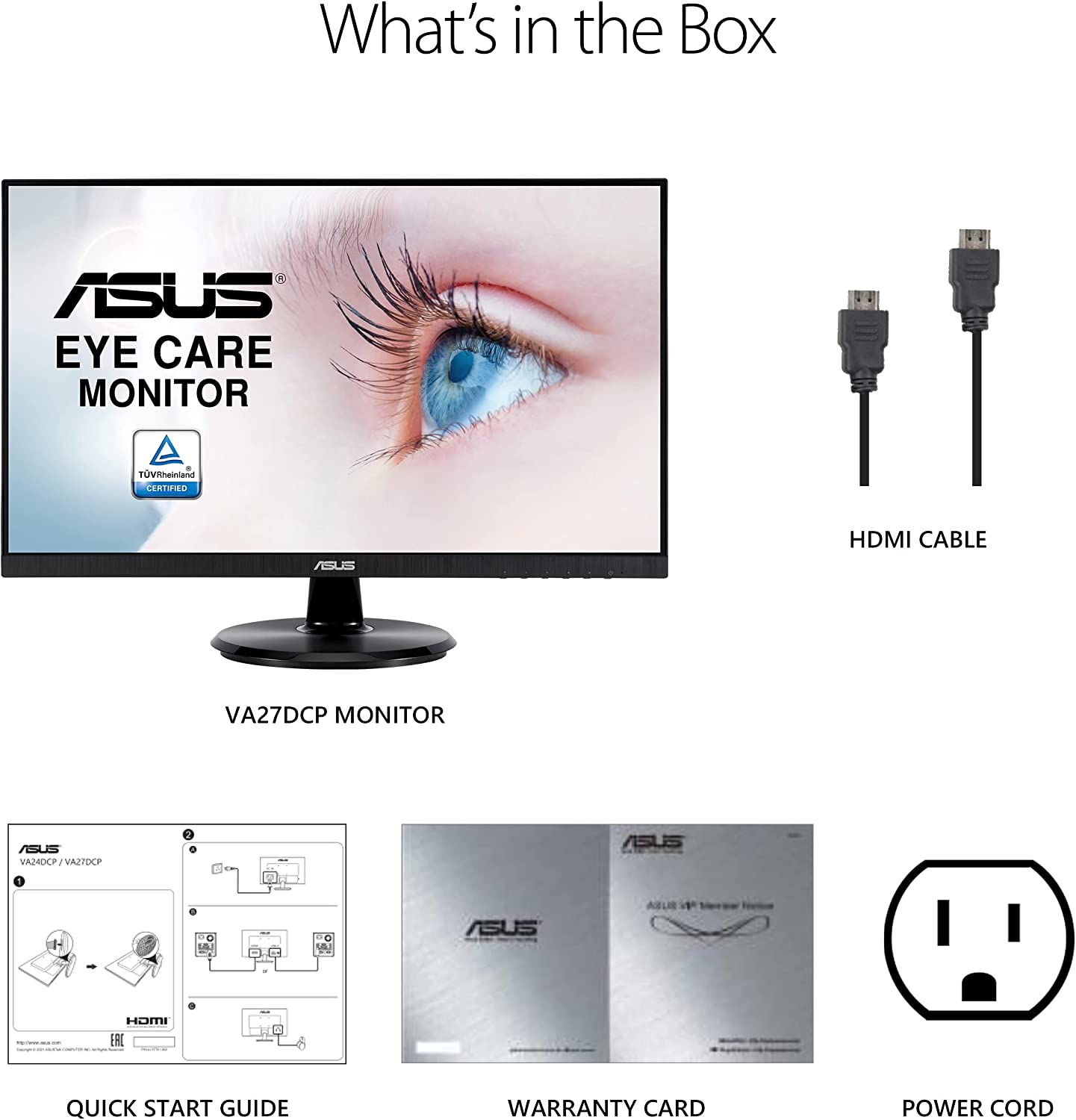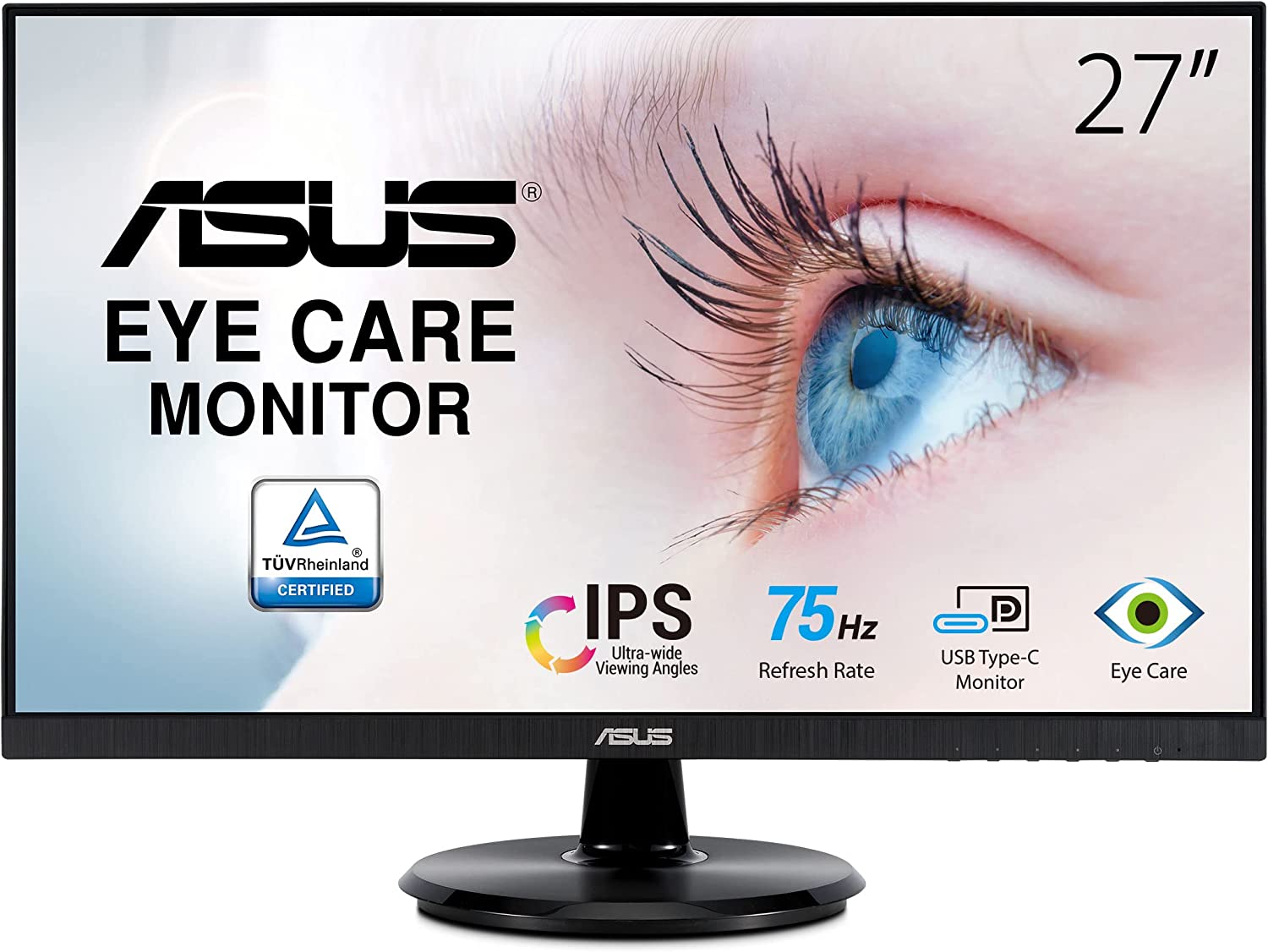 ASUS 27” 1080P Monitor (VA27DCP) - Full HD, IPS, 75Hz, USB-C 65W Power Delivery, Speakers, Adaptive-Sync/FreeSync, Eye Care, Low Blue Light, Flicker Free, VESA Mountable, Frameless, HDMI