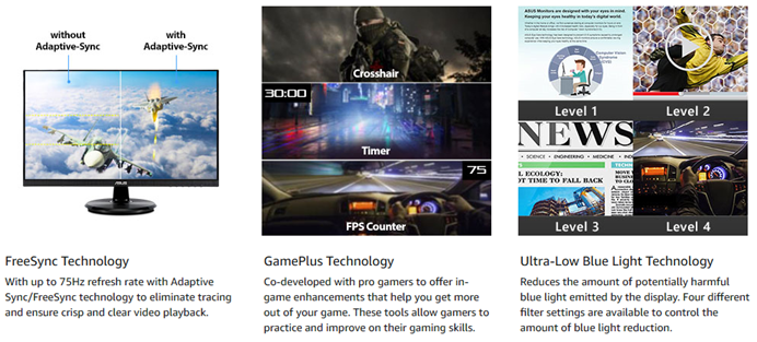 • Up to 75Hz refresh rate with Adaptive-Sync/FreeSync technology to eliminate tracing and ensure crisp and clear video playback