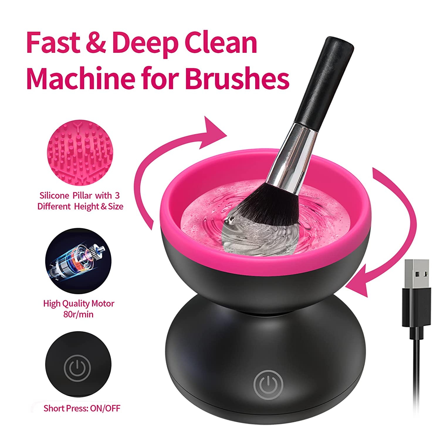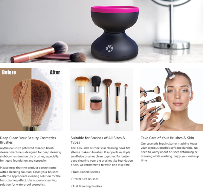 • 【Patented Design & Deep Clean】Alyfini Newest automatic makeup brush cleaner machine aims to deep clean your makeup brushes. The premium motor of about 80r/min ensures that makeup brushes are fully rubbed with three different raised areas. Thoroughly clean inside cosmetics residues, such as foundation and concealer.