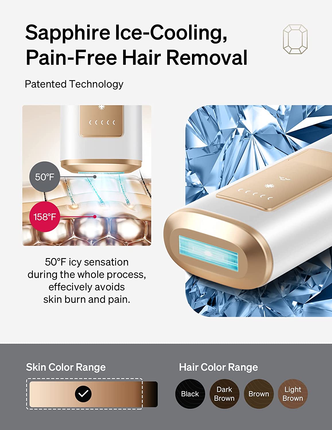 Industry-leading Cooling Technology - Get silky-smooth results without the pain. Ulike adopts clinical-grade sapphire ice-touch technology to lower the epidermis from 158℉ to 50℉ at the point of contact with your skin, avoiding high-temperature burns and epidermal thermal damage.