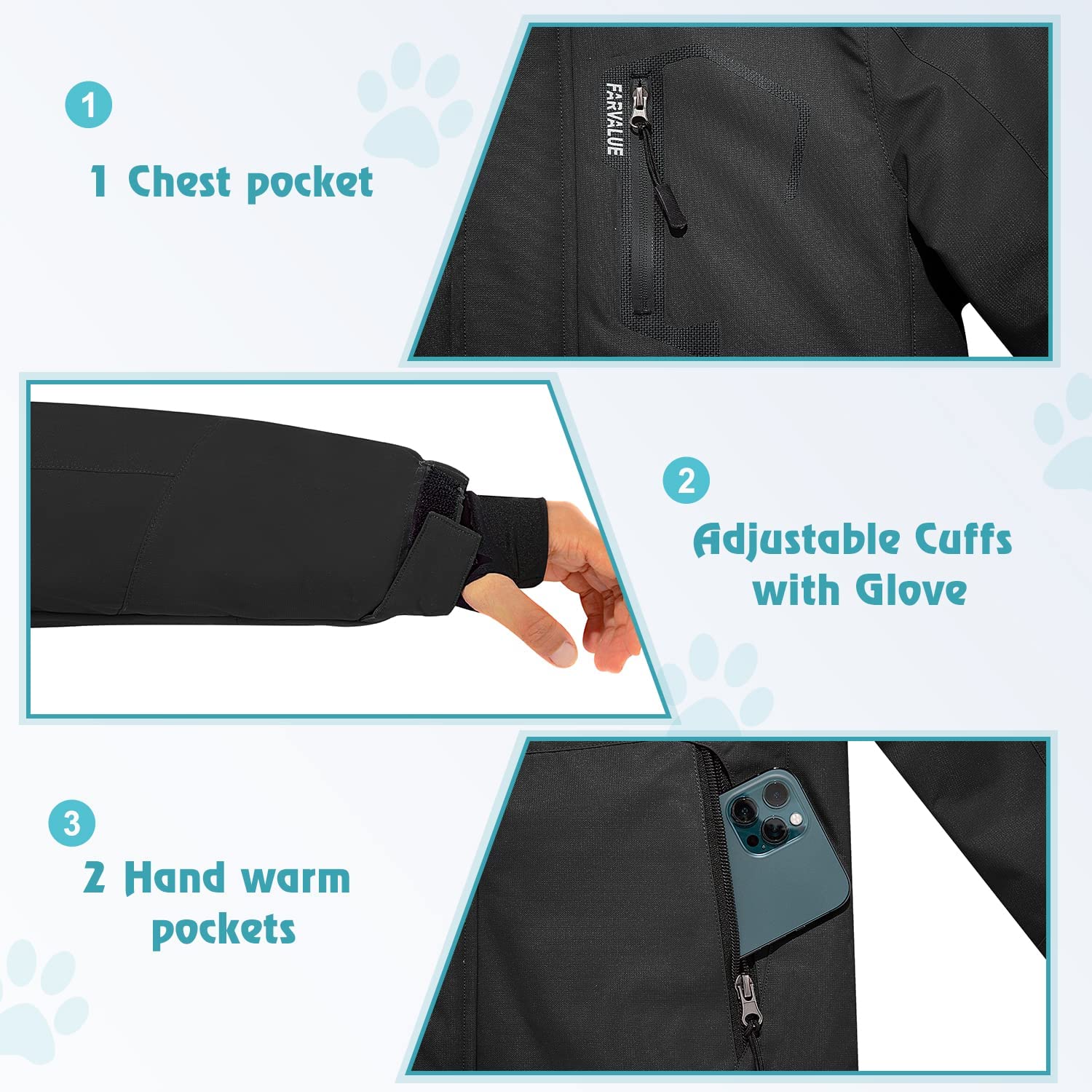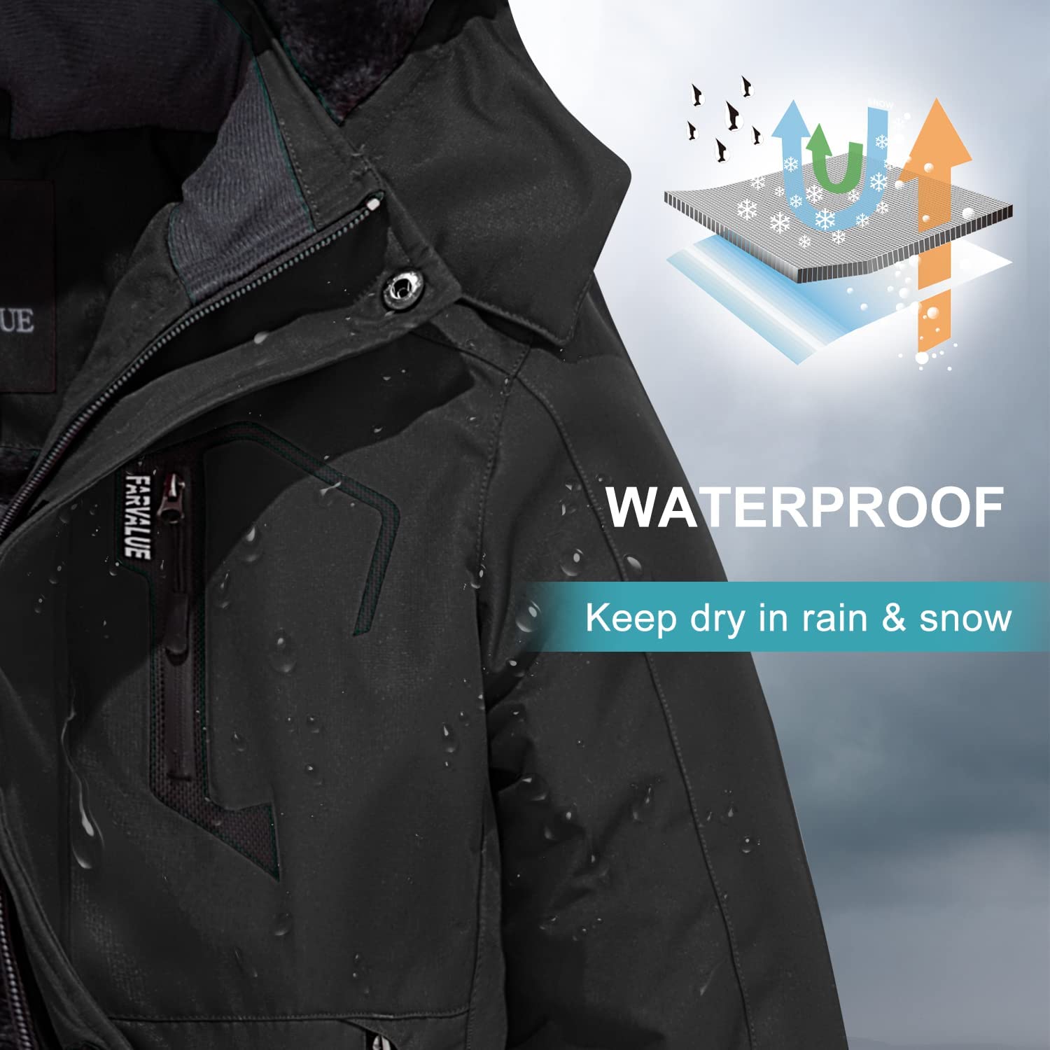 • Waterproof Snow Coat: Made from professional Durable Water Repellent (DWR) coated polyester fabric, which is windproof and durable. This coat can fights light rainy or misty weather.