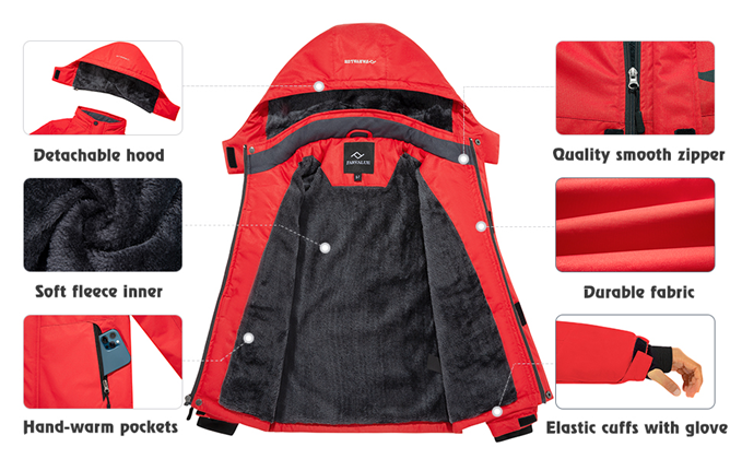 • Windproof Raincoats: (1) Adjustable cuffs and stretchable glove with thumb hole, well-built stiching fuzzy collar to seal in warmth. (2) Removable fleece hood to make the best heat retention in cold days. (3) Stand collar, a full zipper with button placket helps lock temperature.