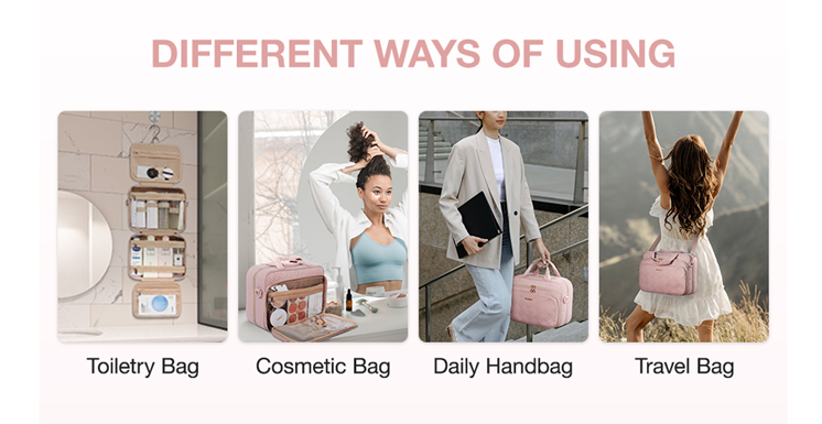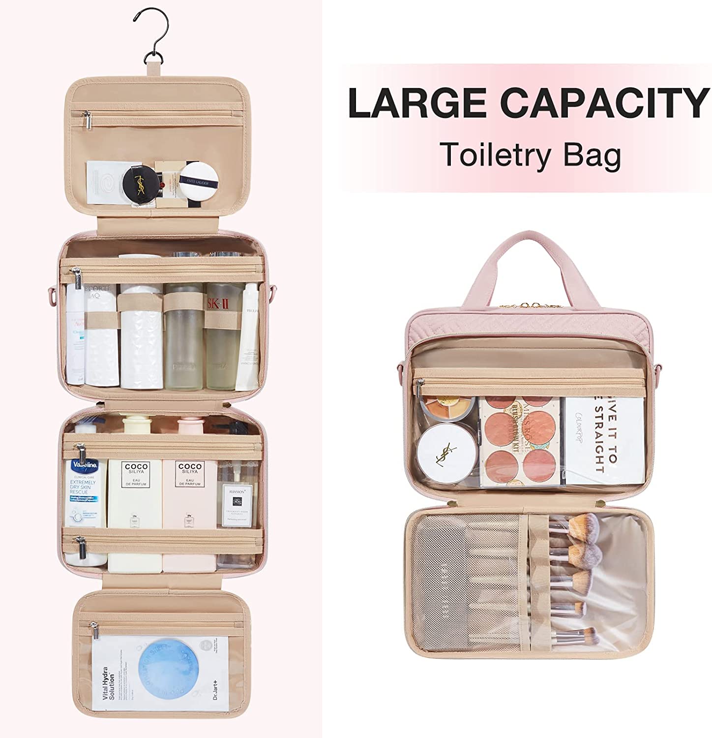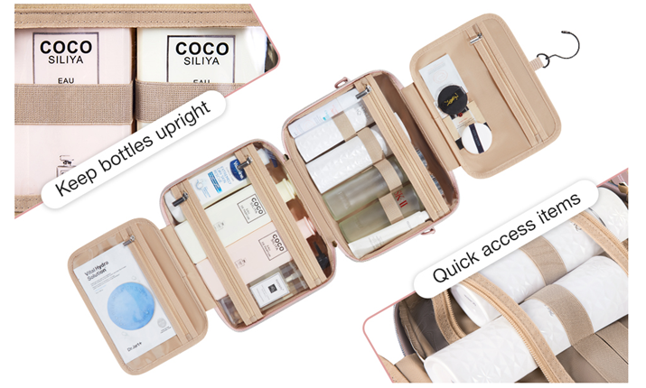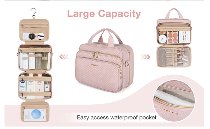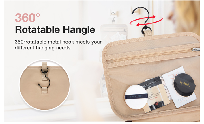 • Special Design - 1 front zipper pocket for storing makeup brushes and cosmetics. Detachable shoulder strap provides a variety of ways to carry. Stow-away 360 degree swivel non-slip metal hook for versatile hanging options.