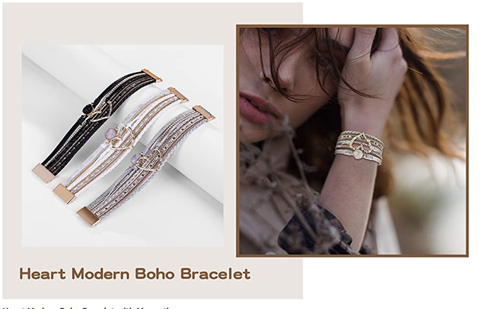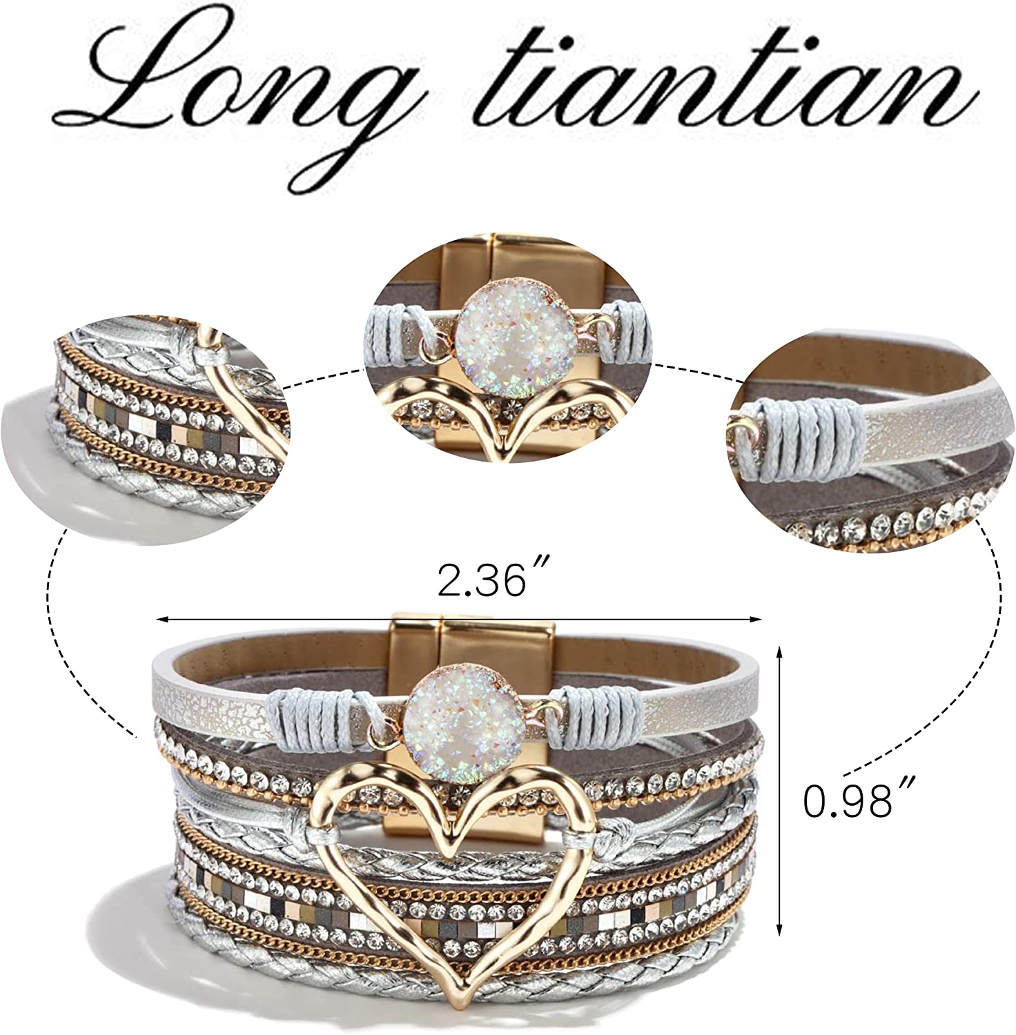 Long tiantian Multilayer Wrap Leather Bracelet Heart Modern Boho Bracelet with Magnetic Clasp Cuff Rhinestone Leather Bracelets for Women