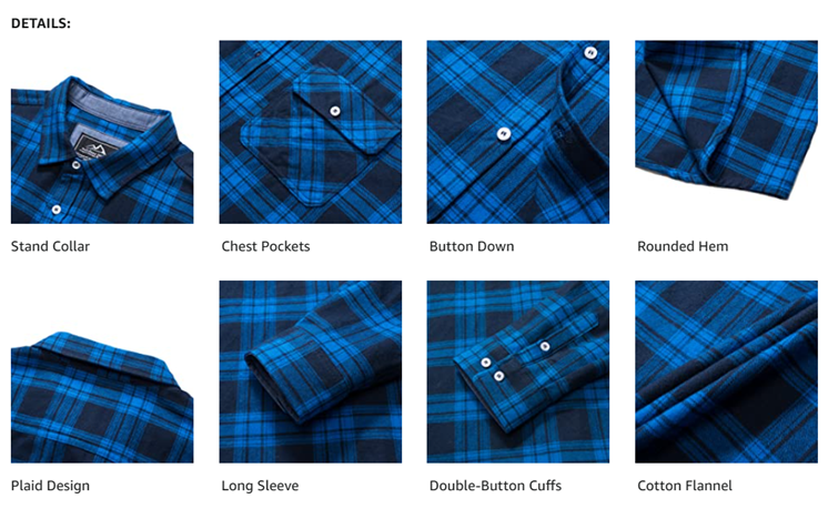 Feature: 2 chest pockets to enough for storing essentials; Rounded hem; Double-button barrel cuffs; Cotton flannel fabric long-lasting wear.