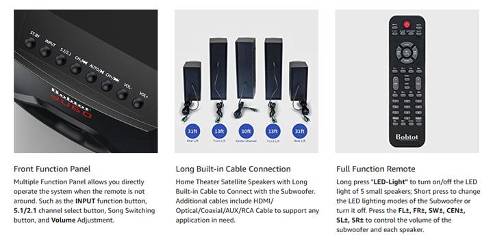 - All Function Remote: This system not only has button control via the front panel but also comes with remote control for more detailed operation. Such as via the remote, you could independently control the volume of each speaker and the subwoofer, or turn on/off the LED light.