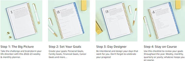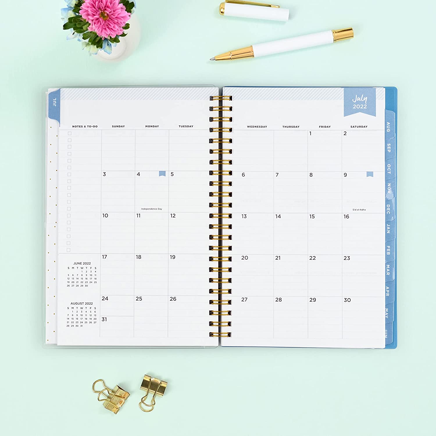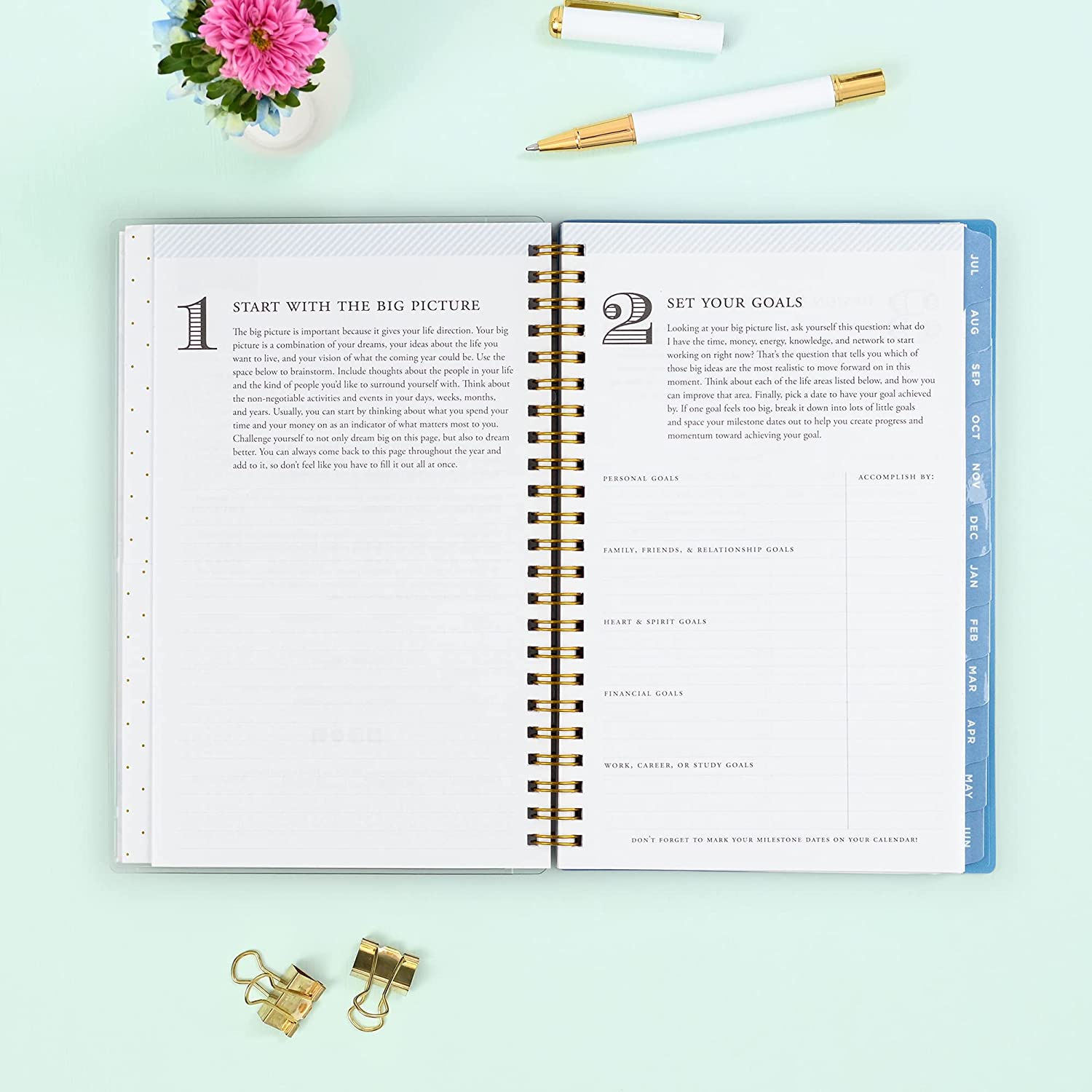 • July 2022 - June 2023 day planner and organizer with weekly/monthly pages and a step-by-step guide for intentional planning; 3 additional monthly pages (April 2022 - June 2022) are included