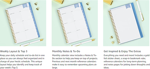 • Weekly calendar view per two-page spread contains ample lined space for both your daily schedule and to-do list, as well as a unique section for your week's top 3