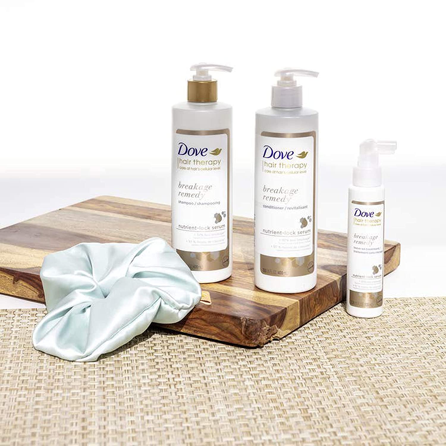 Wondering how to help make hair stronger and reduce hair breakage all at once? This Hair Therapy Regimen kit is for you. We are all about those good hair days – but hair breakage can make us feel less than our beautiful best. That’s why we created our Dove Hair Therapy Breakage Remedy Regimen System for damaged hair. Giving your hair the care it deserves, this strengthening regimen system blends all the care of Dove you know and love, with expert hair care for breakage. Made with our Nutrient-Lock serum, this Breakage Remedy system helps your hair look thicker, stronger, and healthier. Simply smooth it on to enjoy thicker-looking hair with 97 percent less breakage** – and say hello to good hair days every day. Perfect to remedy hair breakage. This strengthening regimen system is made with Nutrient-Lock serum, a mixture of dipeptides and conditioning actives, to help make hair stronger and reduce hair breakage. Gentle, nourishing hair care with a gentle, caring formula, this 3-step system (consisting of our Breakage Remedy shampoo, paraben-free conditioner, and a leave-in treatment) leaves you with beautiful, healthy-looking strands and a refreshed scalp from the first use. Being kinder to the planet: Dove Hair Therapy Breakage Remedy Regimen System has packaging made from 70 percent recycled plastic, so you can be kind to your hair and the environment. Our Hair Therapy range carries the PETA Cruelty-Free logo for added peace of mind. Globally, Dove does not test on animals and is certified Cruelty-Free by PETA.