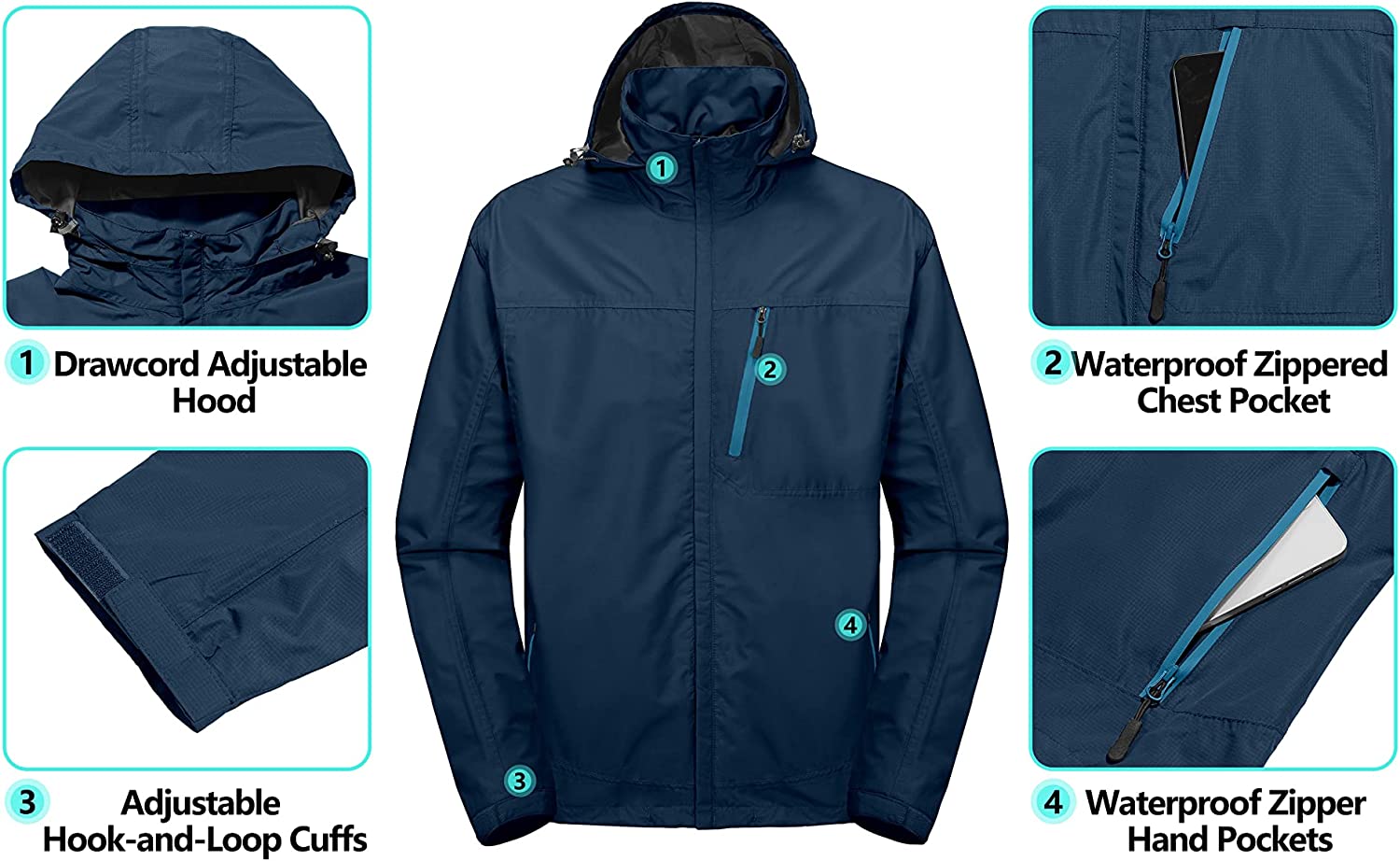 WINDPROOF WATERPROOF JACKET: This mens hooded rain jacket is made of performance windproof and waterproof material, features Waterproof/Breathable Fully Seam Sealed, performs well in windproof and waterproof, keep you dry and comfortable in light rainy day. But We Do Not Suggest to Wear It In Heavy Rain