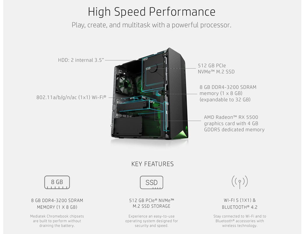 • PHENOMENAL GRAPHICS – Your favorite game titles look incredible and will run at their highest-fidelity thanks to the power-efficiency AMD Radeon RX 5500 graphics card with 4 GB GDDR5 dedicated memory