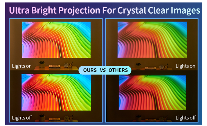 - ?【Native 1080P, 15000L & 550 ANSI Lumens, 4K supported】 2023 upgraded WiFi projector, using the original physical resolution of 1920x1080, has 3 layers of refractive glass lenses. Compared to our competitors who use single layer lenses, we use multi-layer refractive glass lense technology to reduce projecting blurry edges on screen. Its display is calculated to render sharper resolution to the full screen. It has 550 ANSI lumens, much brighter and more colorful than other 1080p projectors.