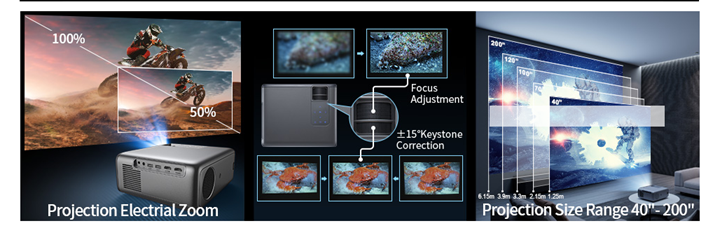 - ?【HiFi Speakers & Low-noise Radiator Fan: 】 We have built-in 10W dual stereo speakers with a HiFi system for a great auditory sense experience. Listen to what you want, not what you don’t with the projector’s optimized low-noise radiator fan, it has a 20% reduction in noise compared to competitors. And because of this improved fan it also helps to extend the life of the projector to 50,000 working hours.