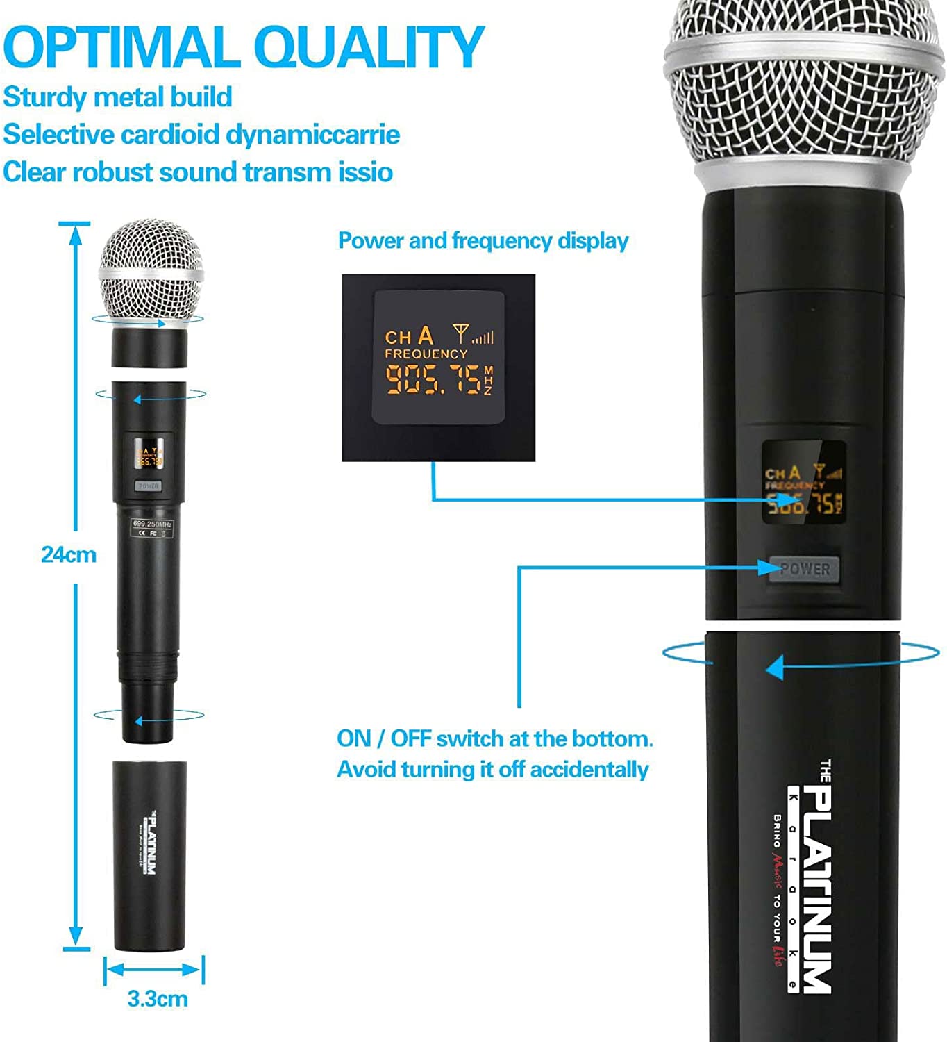 The Platinum Wireless Microphone System, Metal Professional Dual Channel Handheld Dynamic Mic System with Professional Karaoke Receiver, for Party, KTV, Meeting, Wedding, DJ, Church,200ft