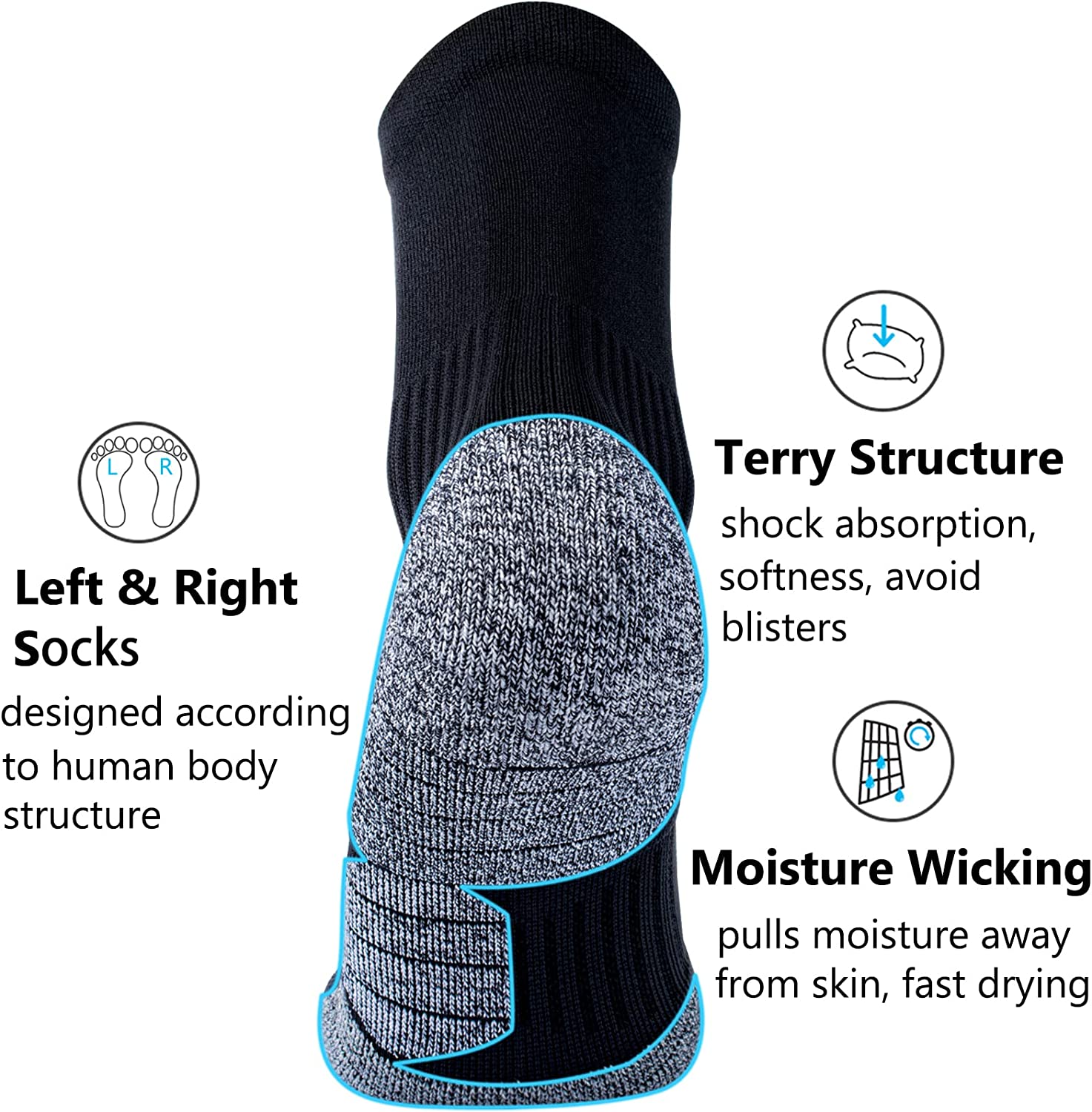 • UNIQUE SOLE: Moisture wicking fibers pull moisture away from skin; Cushioned, more soft and comfy, shock absorption; Design LEFT AND RIGHT SOCKS according to the plantar structure