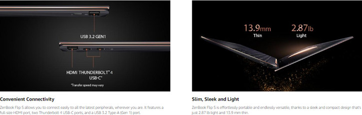 The distinctive ZenBook Flip S combines elegant sophistication with an all-new design that makes it more desirable than ever. Its sleek 4K UHD OLED NanoEdge touch display and 360° ErgoLift hinge make ZenBook Flip S ultra-compact and ultra-versatile. The 11th Generation Intel® Core™ processor and Thunderbolt 4 connectivity deliver effortless performance for on-the-go productivity and creativity. The high-capacity battery in ZenBook Flip S provides up to 15 hours of battery life. ZenBook Flip S brings you flexibility and performance with a touch of luxury.