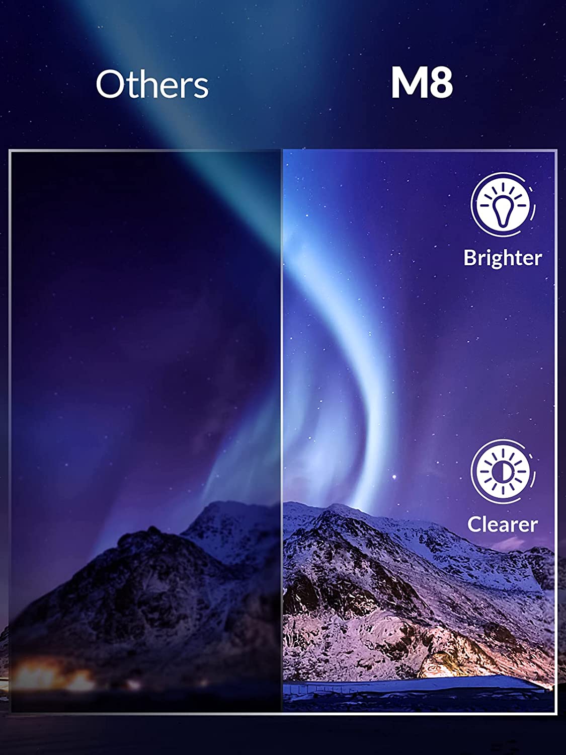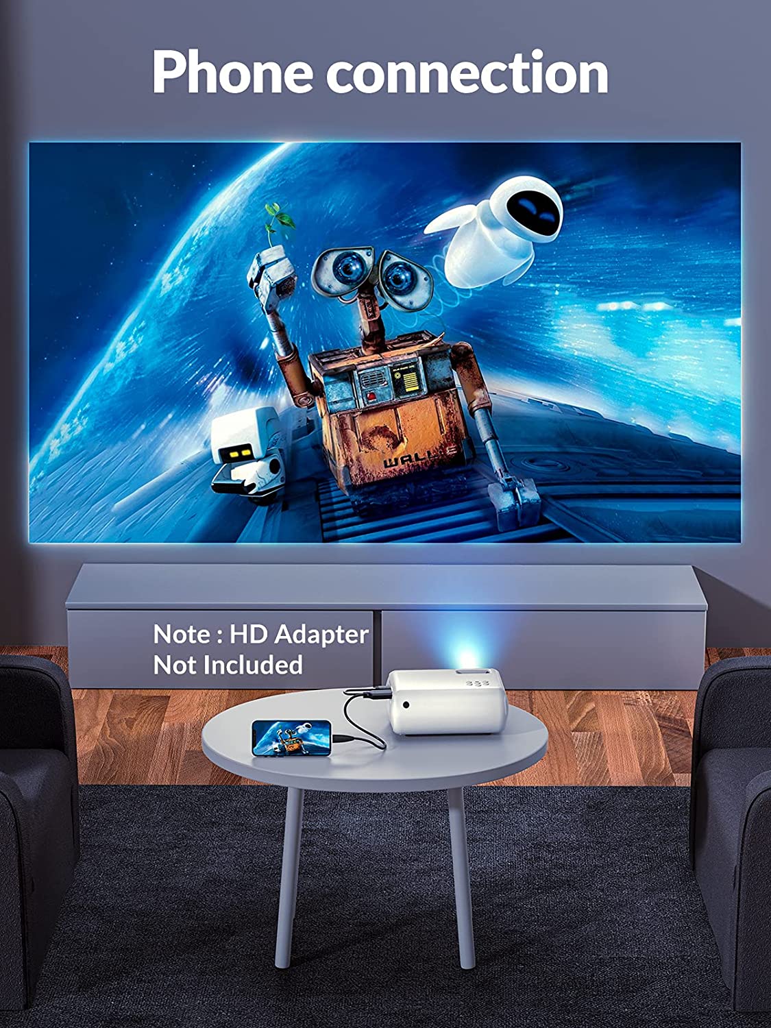 • 【2023 Upgrade Mini Projector】 Mini projector has 9000 Lux brightness and supports 1080P Full HD 30-180(Recommended for 60 -100 inches) inch display, adopting advanced LED technology and uniform illumination method, which make the edges of the projection brighter and clearer. These ensure the projection image quality presents a real, dynamic, and color-vibrant effect. The mini projector also applied diffuse reflection technology, protect your eyes away from tiredness.