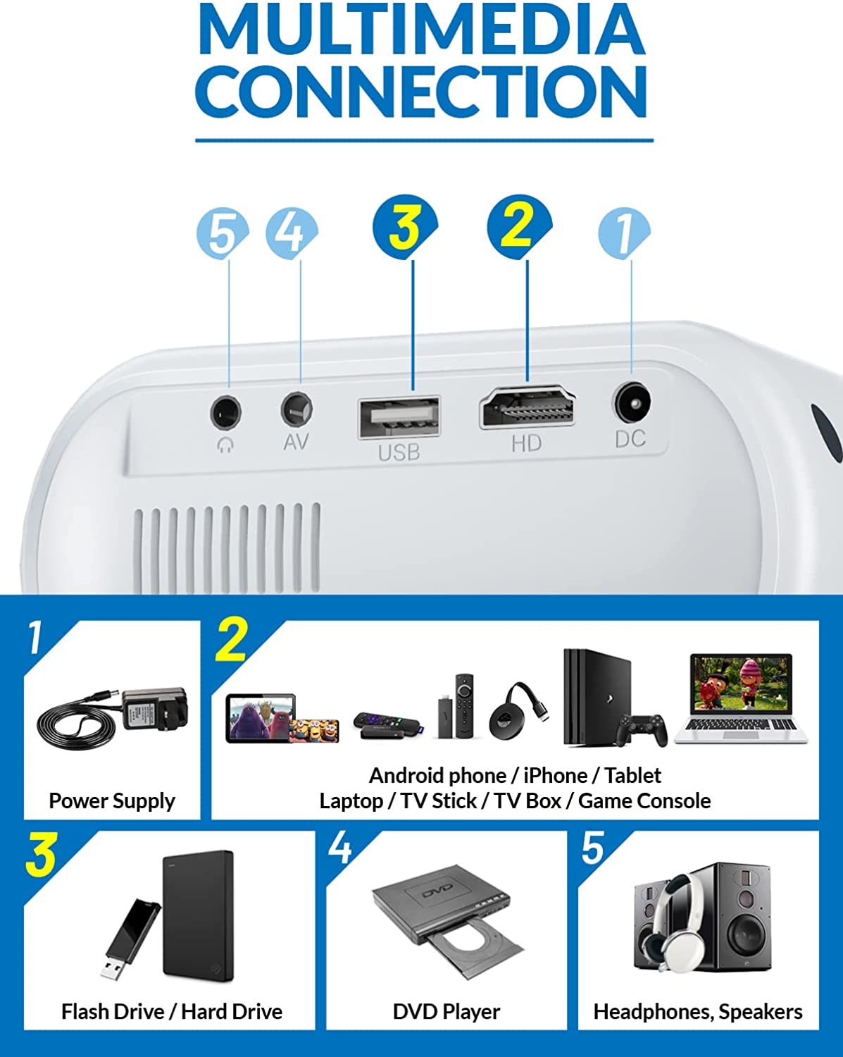 • 【Mini & Portable Projector】 This mini projector has a unique and elegant design with a size of 6.74x5.28x2.96 inches and a weight of 0.72 kg. It is small enough to fit in your bag. Moreover, there is a handle on the product box for carrying. Therefore, it is rather light and handy to carry when you go out.