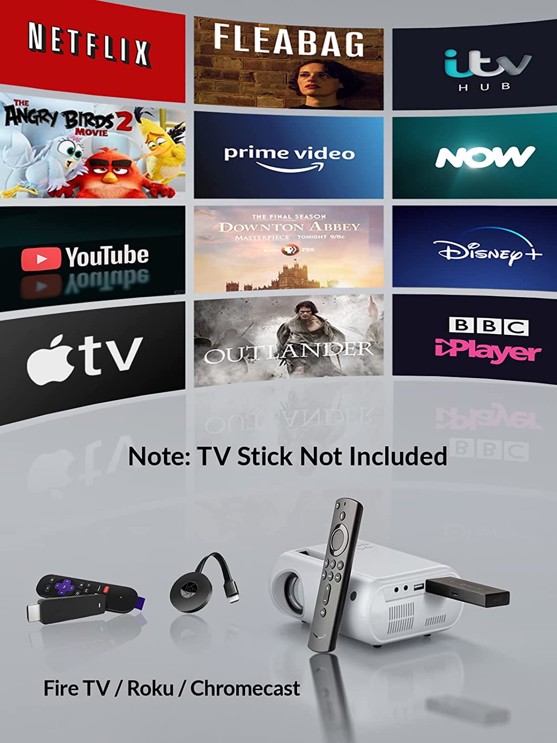 • 【Multiple Devices Connection & Wide Application】 Equipped with HDMI, USB, and AV interfaces, the movie projector works perfectly with iPhone/Android Phone, Tablet/iPad, Laptop, Macbook, Blu-ray Player, TV boxes, DVD players, PS4, USB flash disks, etc. It can be applied to home theaters, video games, parties, and outdoor activities. ☛( Note: Due to HDCP copyright, this projector doesn't support Netflix, Amazon Prime, and Hulu, but you could use Amazon Fire Stick or Roku Stick.)
