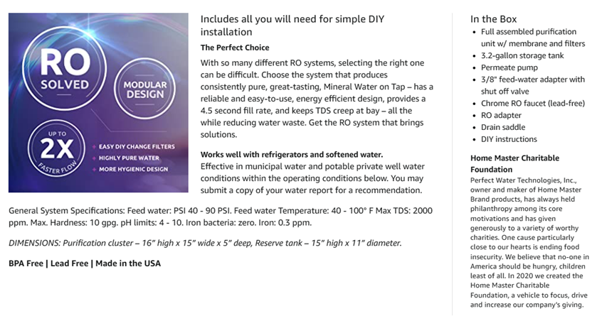 The Home Master Artesian Full Contact with Permeate Pump Undersink Reverse Osmosis System delivers exceptional water purity while also adding beneficial minerals that produce clean, great-tasting mineral water on tap. The built-in non-electric permeate pump will reduce water waste while increasing water production. Home Master's innovative design eliminates the most common problems found in traditional RO systems -- canister filter housing leaks, slow flow rate, high water waste, service challenges, and slightly acidic water. Its superior performance has made it one of the best RO systems on the market and it. What makes the Home Master Artesian Full Contact with Permeate Pump a smarter choice? Clean, great-tasting water; modular filter design; better water efficiency; easy-to-change filters; and a faster flow rate. Home Master components included in the design and construction of this product meet or exceed NSF standards for material safety and water purification performance. This package contains a fully assembled purification unit that includes the RO membrane and filters, storage tank, 3/8-inch feed-water adapter with shut off valve, chrome RO faucet, RO adapter, drain saddle, and instructions.