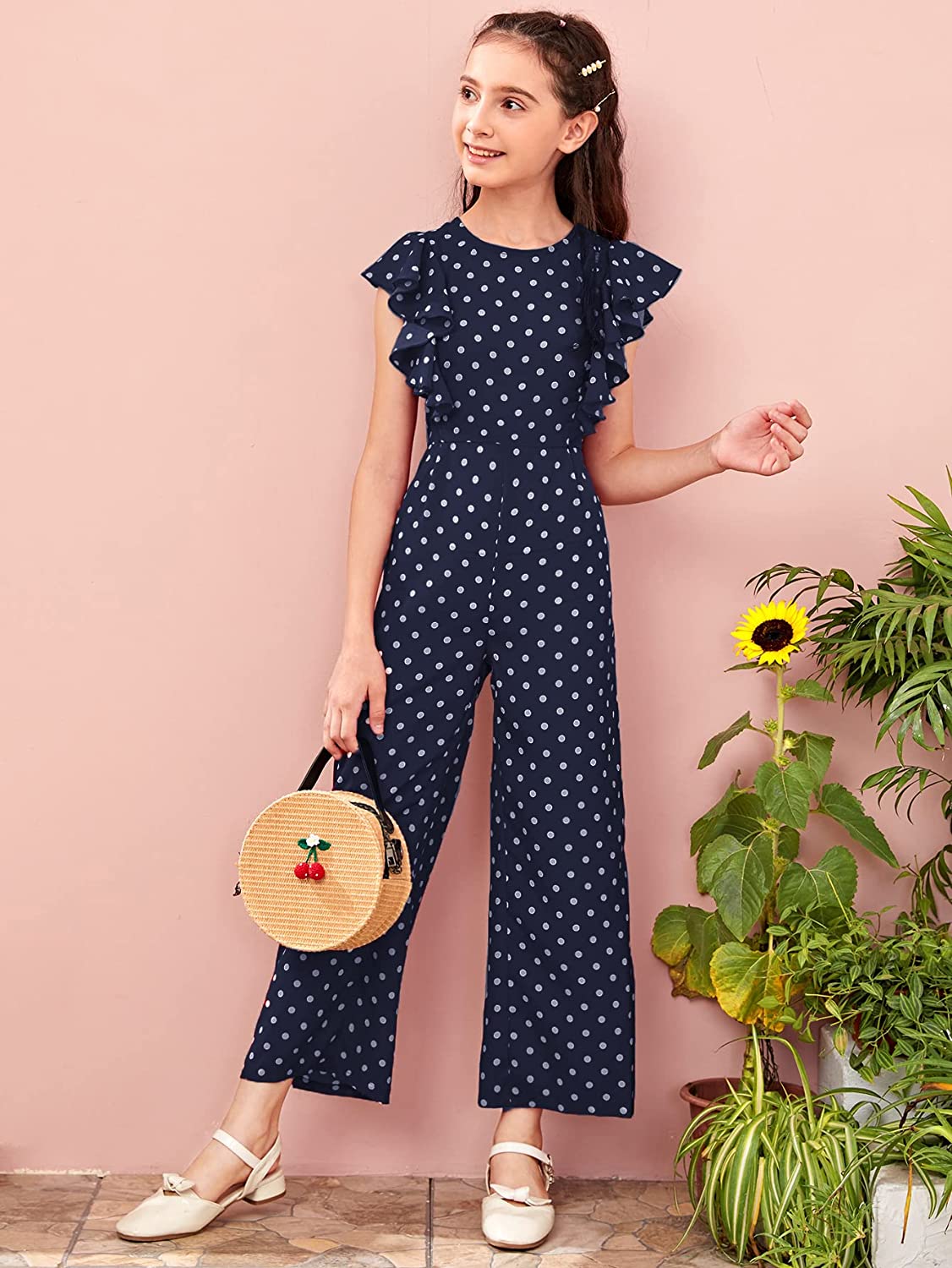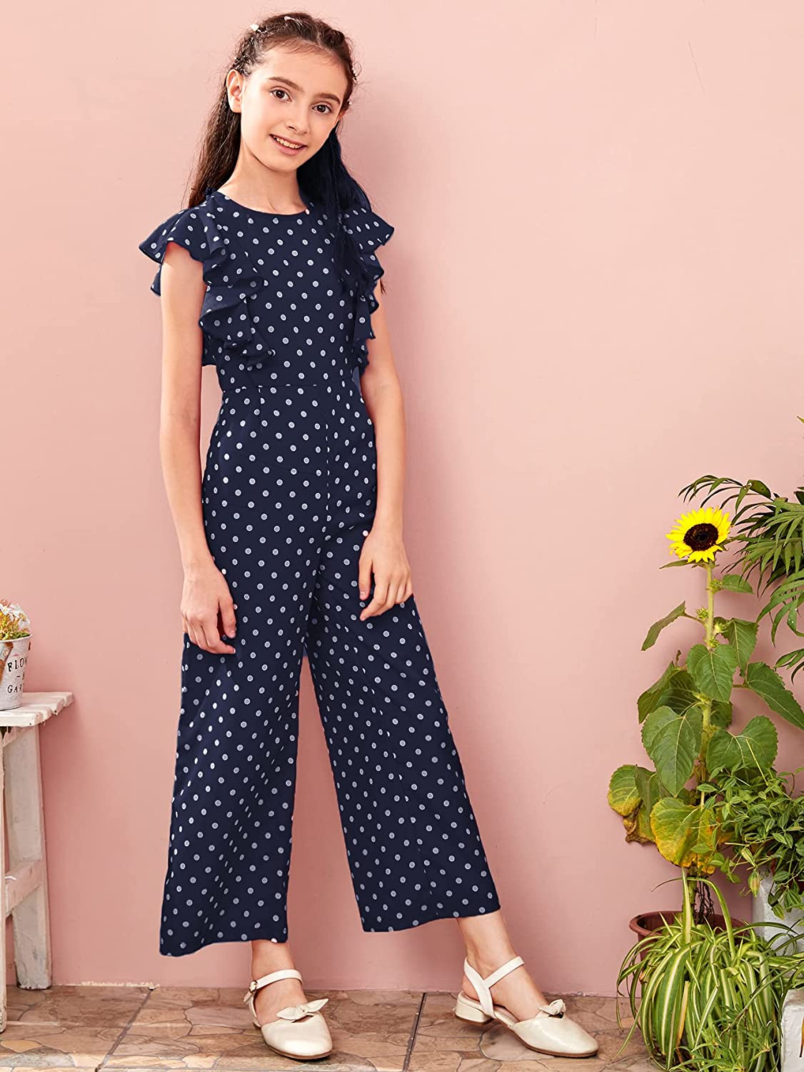 WDIRARA Girl's Polka Dots Ruffle Trim Cap Sleeve Round Neck Wide Leg Jumpsuit