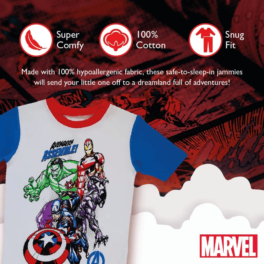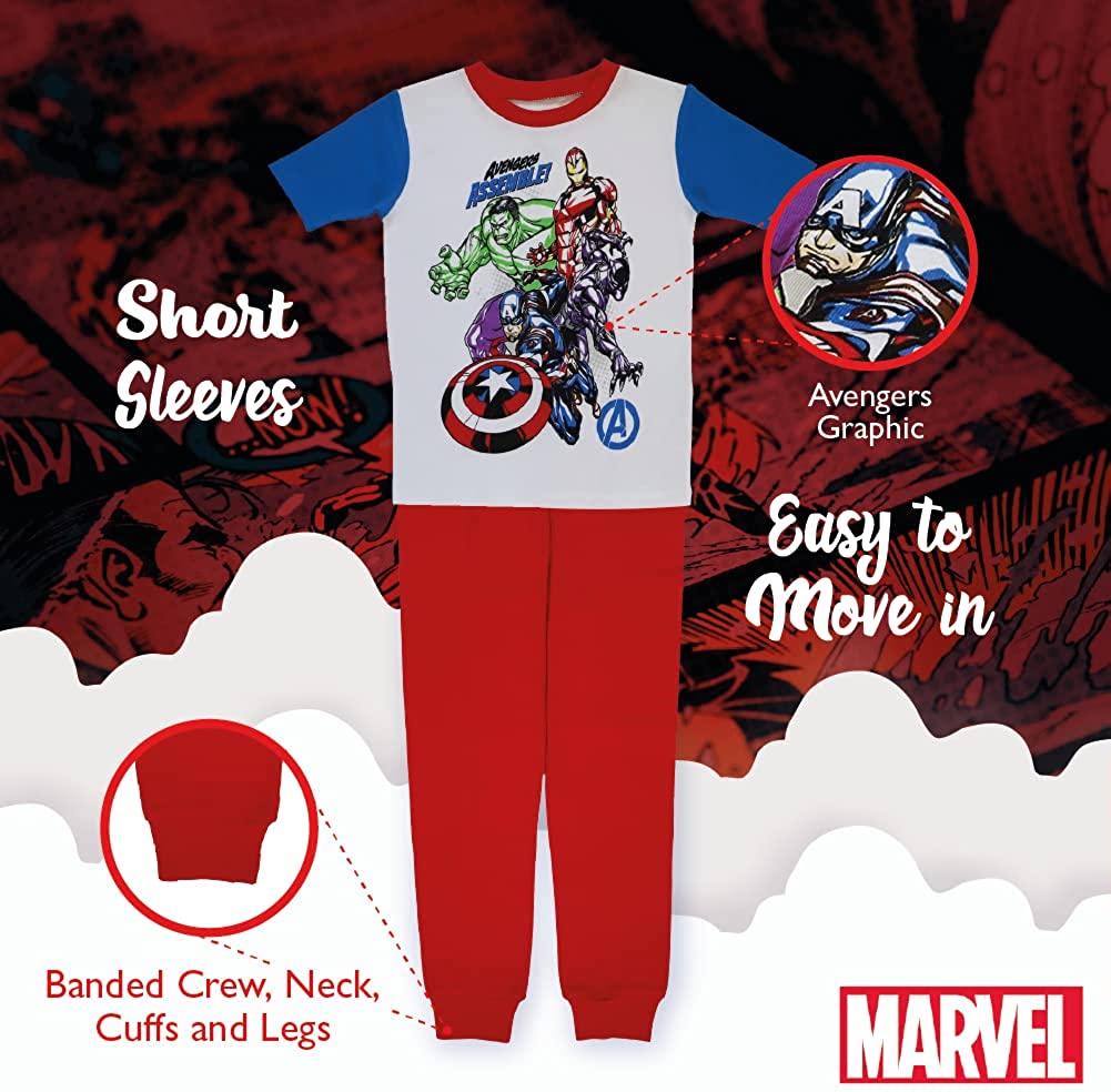 Your little one will love wearing this soft, comfortable pajama set featuring their favorite Marvel pals. Perfect for nighttime use or lazy days of play, these pajamas will become your child’s new favorite bedtime clothes.These pajamas are available in a variety of styles and in sizes 2T–4T and 6–10. They are made from high-quality 100% cotton and feature rich colors and fun character graphics. The cuffed footless pants leave feet free for easy walking and playing and provide a comfortable, close fit. These cozy pj’s can be machine washed and dried on a gentle cycle.This officially licensed Marvel merchandise is made from high-quality materials with safety and comfort in mind. To ensure maximum comfort and safety, please choose the right size for your child. These pajamas are manufactured in accordance with all clothing safety standards and are not flame-resistant. Let your child put on these fun pajamas and live out their adventures while they sleep or play.