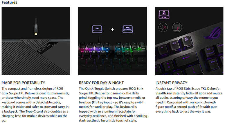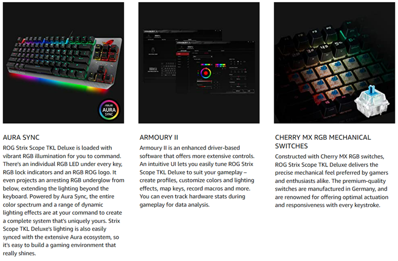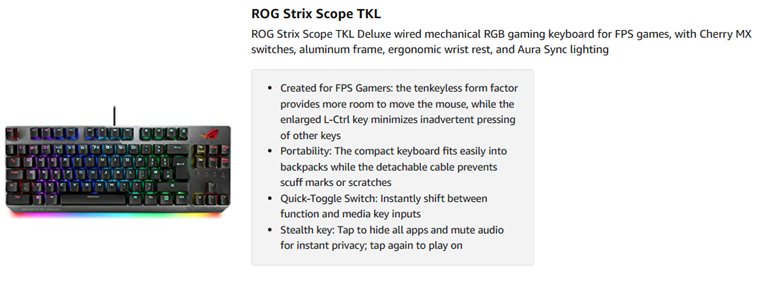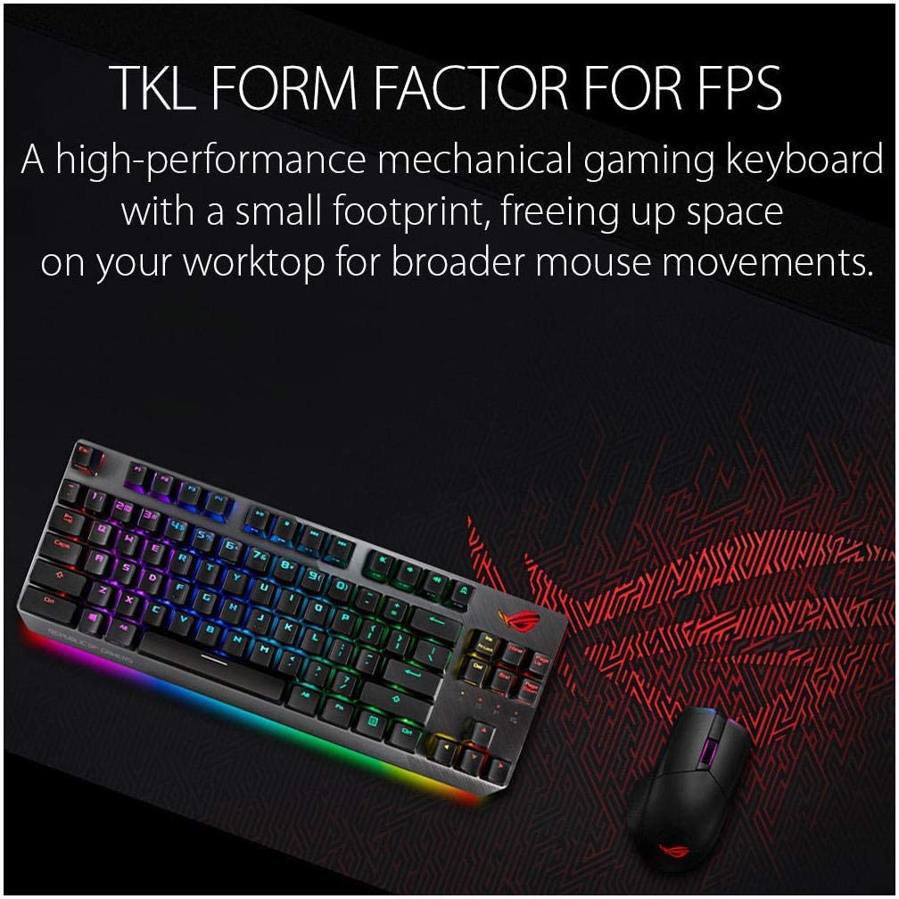 • COMPACT GAMING KEYBOARD - Designed to provide broader mouse space, ASUS ROG Strix Scope TKL Mechanical Gaming Keyboard is made of German Cherry MX Brown switches that offer enhanced gaming performance with faster, more responsive keystrokes