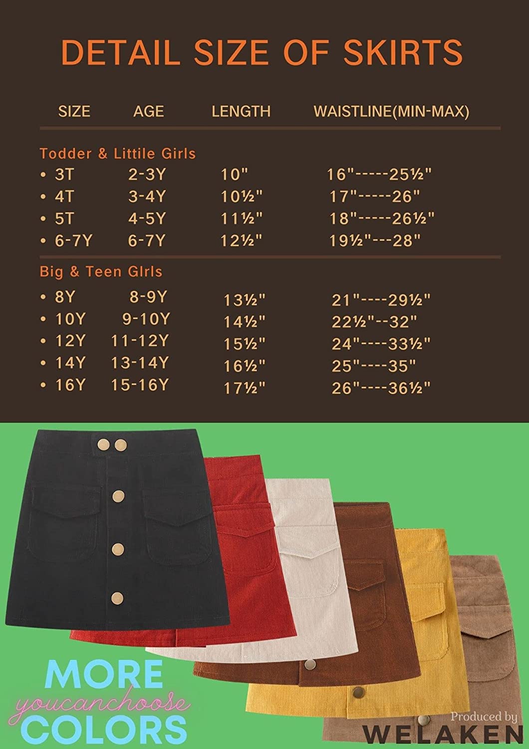 • ?INTRODUCTION:Our Gir's Corduroy skirts is made from a soft cotton corduroy fabric; this is an Above-knee skirt , a versatile casual look, you can pair it with her favorite tops, tees ,sweaters and leggings for added style.