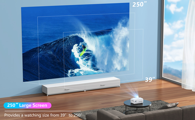 Built-in large lens with super high light transmission and large LCD panel project a larger image with higher light transmission than the standard built-in LCD panel under the same projection distance. With full HD image quality, ultra-high contrast ratio, bright colors, excellent audio system, and high resolution, adopting the latest diffuse projection technology, it also provides a watching size from 39” to 250”. You can freely adjust the screen size and projection distance.