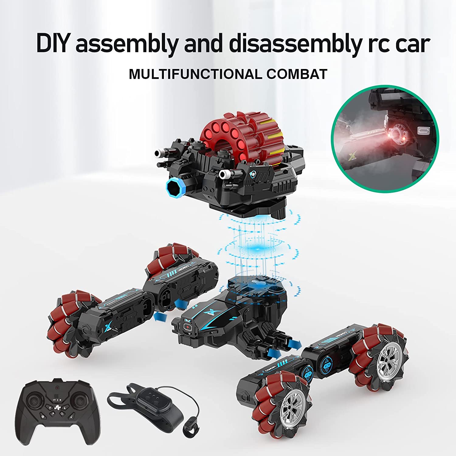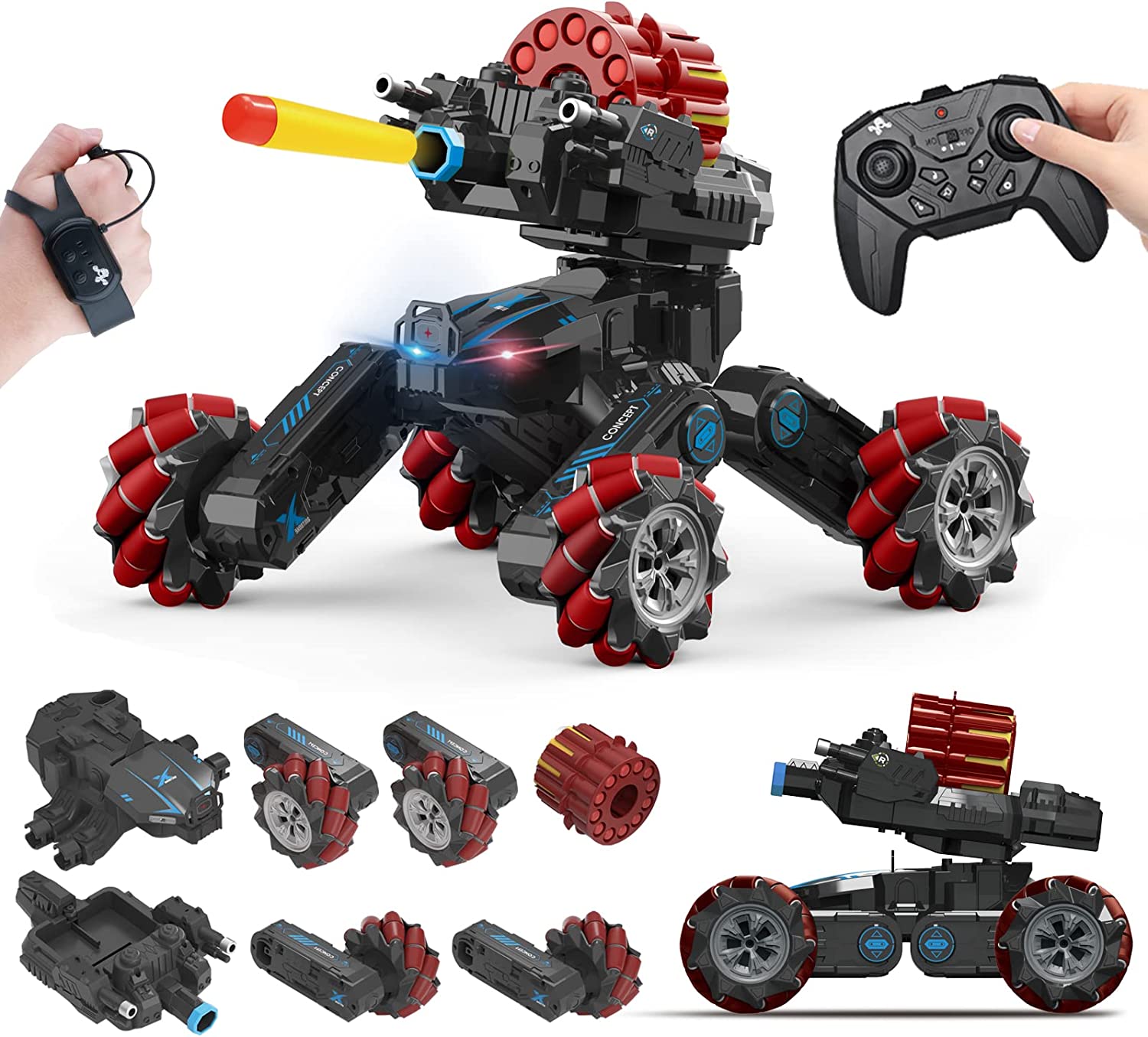 • 【Rich Collocation】The package includes 1 RC car body, 4 RC car wheels, 1 remote control, 1 watch remote control, 1 rechargeable battery, 12 soft bombs, 1 watch charging cable, 1 charging cable, 1 screwdriver, 1 water bottle, 1 water bomb bottle, and 1 manual.