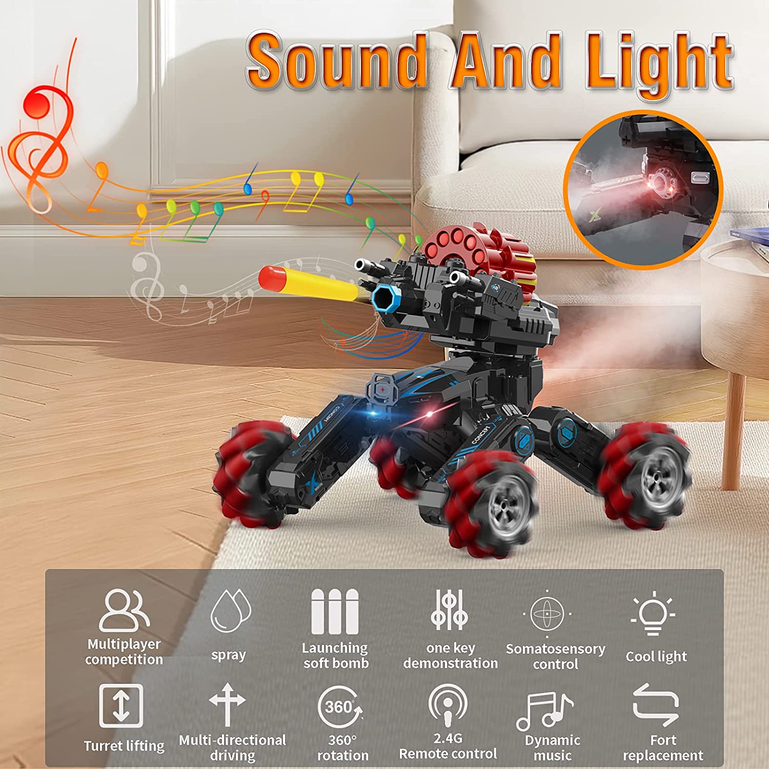 • 【Remote Control Car DIY】The high-quality modular accessories make this rc tank easy to assemble and disassemble, increasing playability and fostering DIY ability in kids. The car comes equipped with a water spray and flashing LED lights, adding to the excitement of battles and stunts. The 360° rotating function and music feature make for an immersive and fun experience.