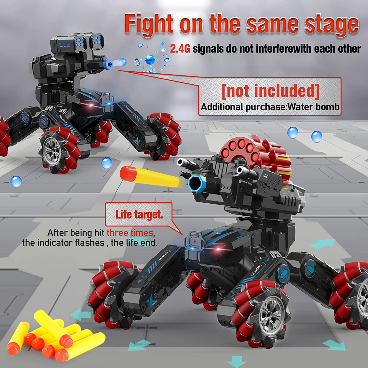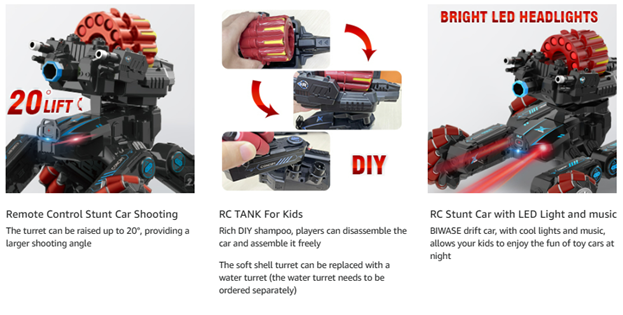 • 【RC Cars For Boys】This RC drifts car is perfect for boys competition and racing with its interchangeable turrets that shoot soft darts or water bullet bombs.The one key demonstration feature and racing and climbing mode make this car perfect for family activities.