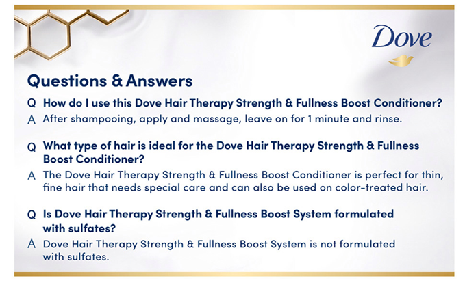• Use Dove Hair Therapy Strength and Fullness Boost Conditioner to nourish and soften hair from the first use