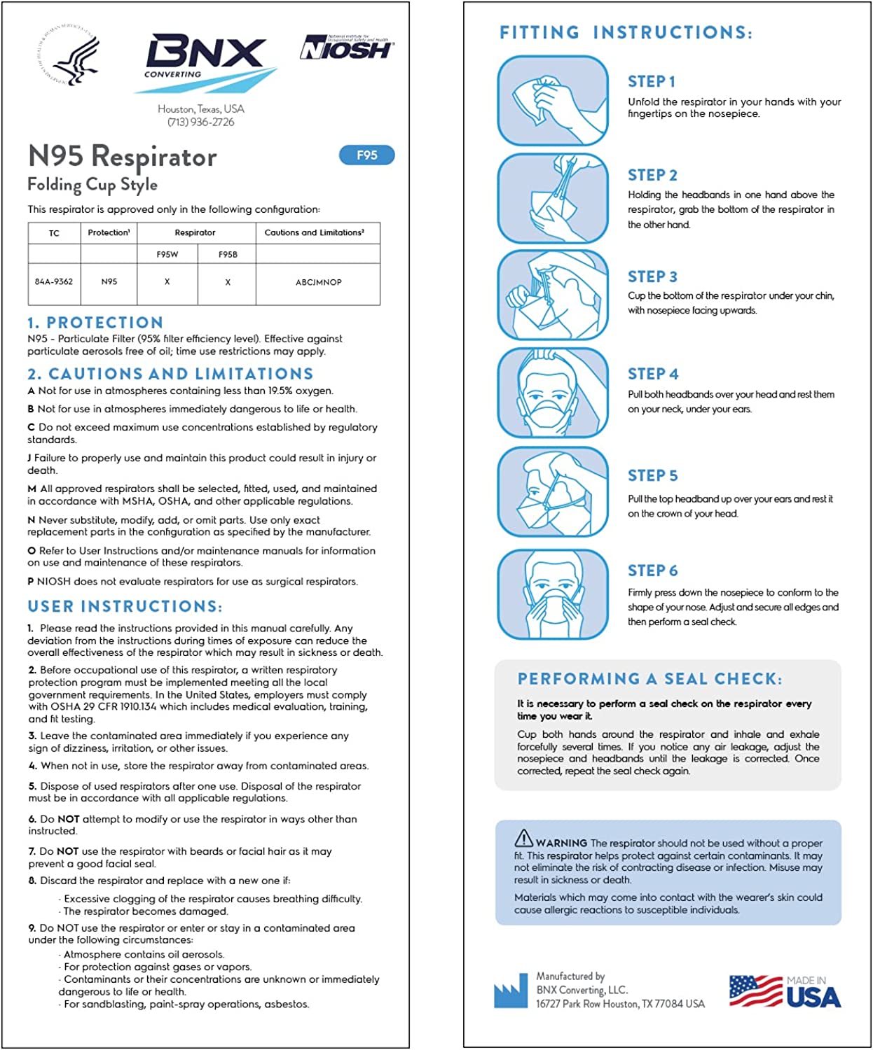 MADE IN USA – Manufactured by BNX Converting LLC in Houston TX, a NIOSH/CDC Approved and FDA Registered (Registration # 3017489417) manufacturer of N95 mask respirators.