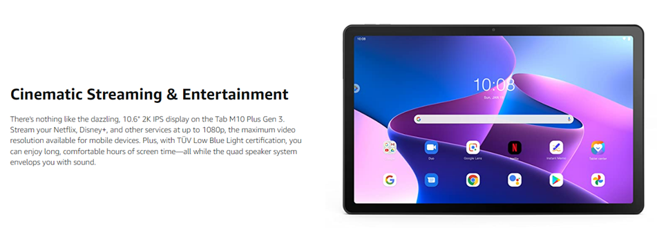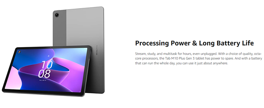 You can binge longer and study smarter with the Lenovo Tab M10 Plus 3rd Gen Android Tablet. Sleek, thin, and lightweight, this handy 10-inch tablet goes wherever you do, packing power and performance into a bold and contemporary aluminum chassis that's just 0.29" thin and as little as 1.03 lbs. Slip your Lenovo tablet into a shoulder bag, your school backpack, or carry it in folio case (available separately). The bright and colorful 10.6" display offers full HD clarity, so you can stream your favorite movies and shows for hours! Plus, with the special Reading Mode and TÜV Low Blue Light certification, you can enjoy long, comfortable hours of screen time on this Android tablet without straining your eyes. Music and audio sound great with the immersive quad speaker system optimized with Dolby Atmos®.This portable entertainment tablet is great for students, too, as you'll enjoy all-day performance with octa-core CPU and long battery life – including up to 12 hours of video playback time*. Take it with you wherever you go for reading, note-taking, streaming, and staying connected. With WiFi and Bluetooth® built in, you can watch your favorite movie, check your email, or have a video chat with friends or family from home or on the go.* All battery life claims are approximate and based on internal testing under optimal laboratory and network conditions. Actual battery performance will vary and depend on numerous factors including product configuration and usage, software, operating conditions, wireless functionality, power management settings, screen brightness and other factors. The maximum capacity of the battery will naturally decrease with time and usage.
