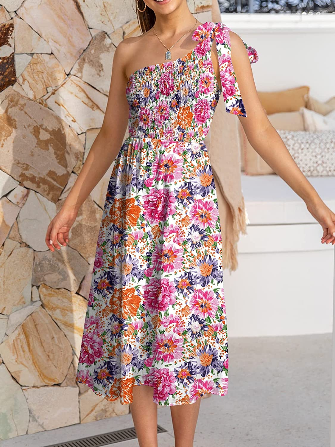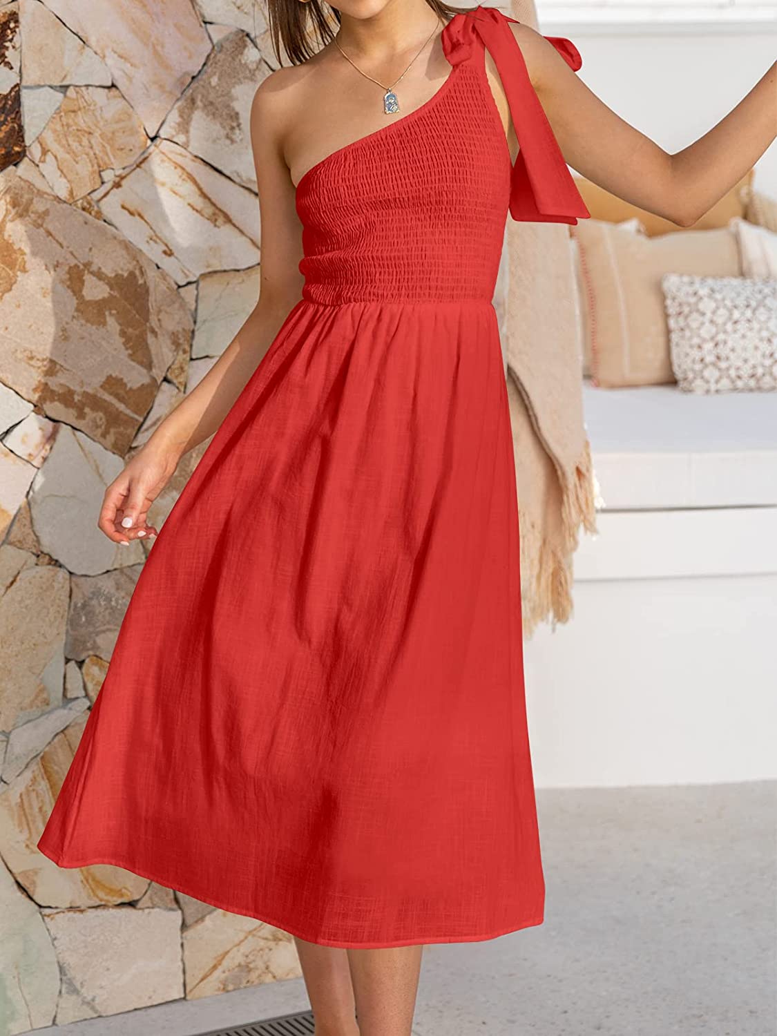 • Features - Sleeveless summer dress,Solid color,floral print more than 10 colors. One shoulder,tie knot on shoulder,shirred bodice and midi skirt,Summer beach party dress,super cute flowy long dress.