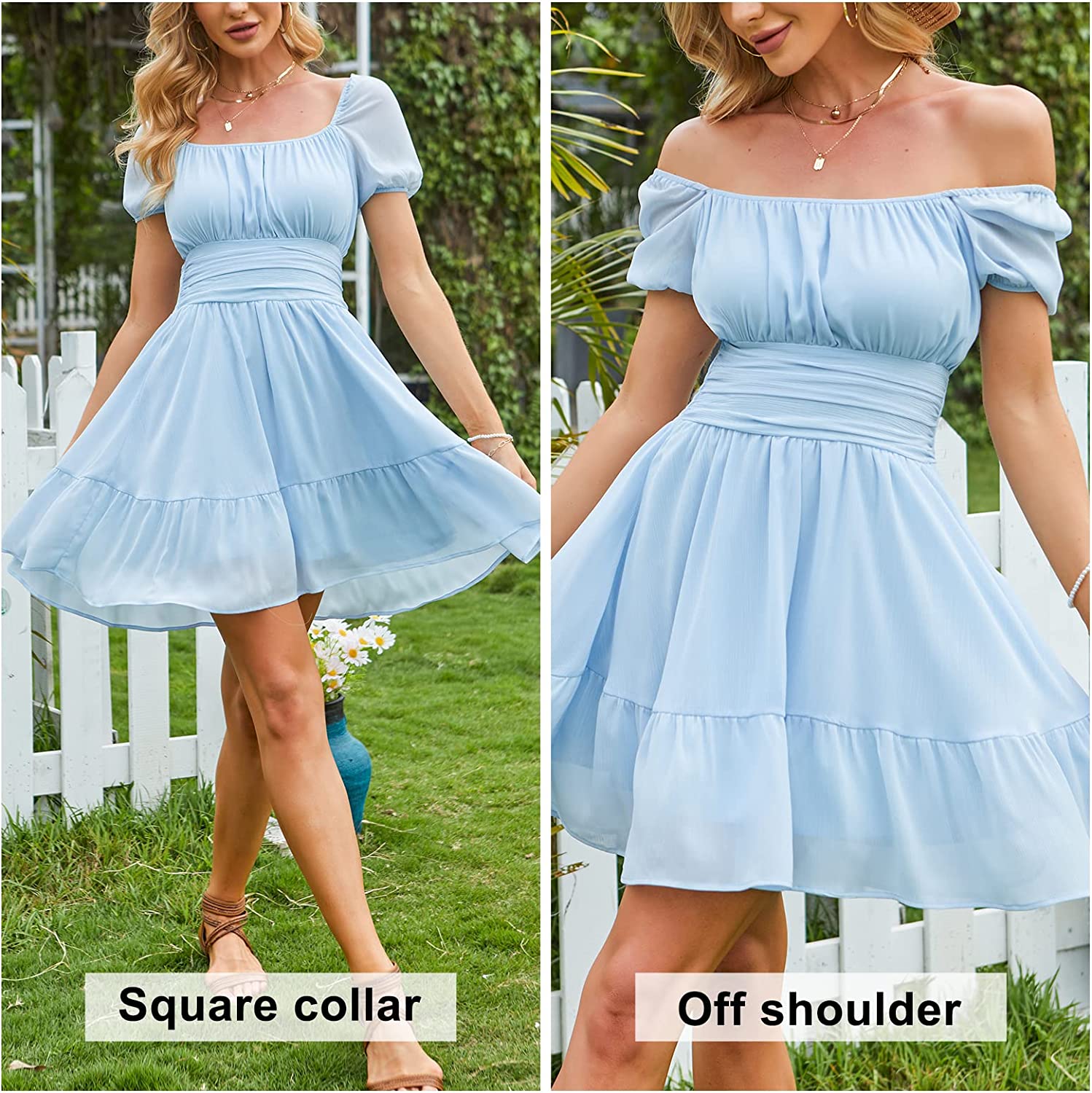 Design: Square neck, off shoulder, ruched bust, puff short sleeve, smocked, elastic waist, high waist, A line silhouette, solid color, mini dress, frill hem, flowy swing dress, open back