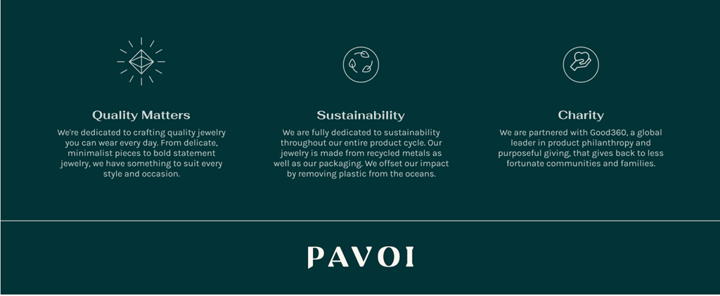 • ✦ SUSTAINABILITY ✦ PAVOI is dedicated to sustainability throughout our entire product cycle. Our jewelry is made from 100% recycled materials and we package in 99% recycled and compostable materials. We work to reduce our carbon emissions and offset plastic consumption by removing 275,000 bottles from oceans annually. We are committed to maintain a balanced and eco-friendly business that minimizes our environmental impact. Trust that PAVOI is continuously working towards a greener future.