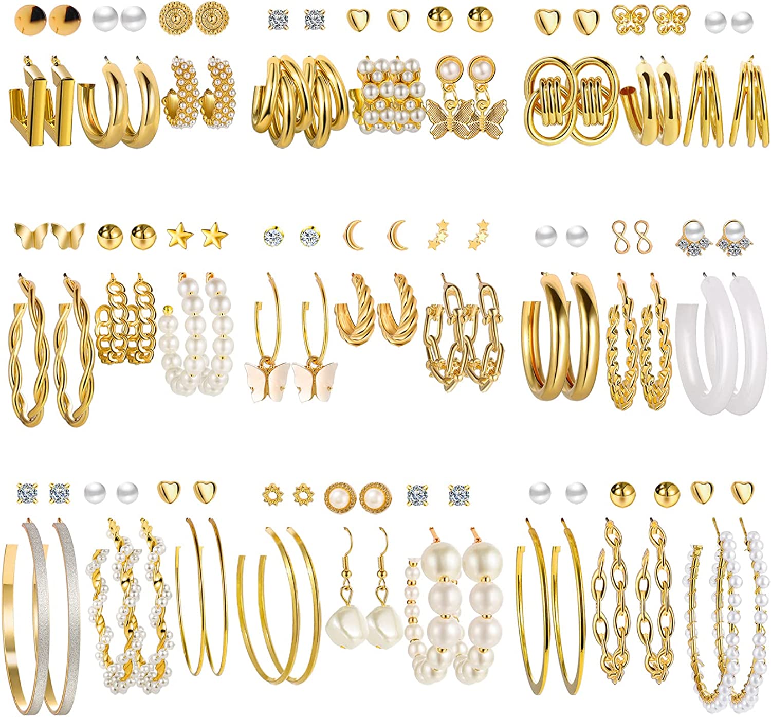 ❤A VARIETY OF GOLD EARRING SET❤:You will get 54 pairs of gold earrings that have a variety of the shapes and sizes, like pearl stud hoop drop dangle earrings, butterfly earrings, providing you with many different choices to choose from, and go with your outfits for any occasion.