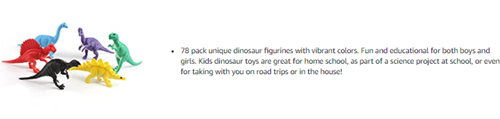 - These mini dinosaurs measure an average of 2.5" from head to tail (may be a diagonal measurement depending on dinosaur). These dinosaurs are tested and approved by real kids (and adults and scientists as well). Our dinosaurs are the perfect size for party favors, birthday party games, educational displays, decoration, or rewards! Dinosaurs are designed with high durability in mind, and are built to withstand rough and hands-on indoor and outdoor play!